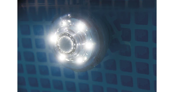 LED bazénové světlo se zabudovaným hydroelektrickém generátorem (generuje el. energii díky proudění vody z bazénové trysky). Je bezpečné a nehrozí úraz proudem. Prvky na uchycení jsou součástí balení.