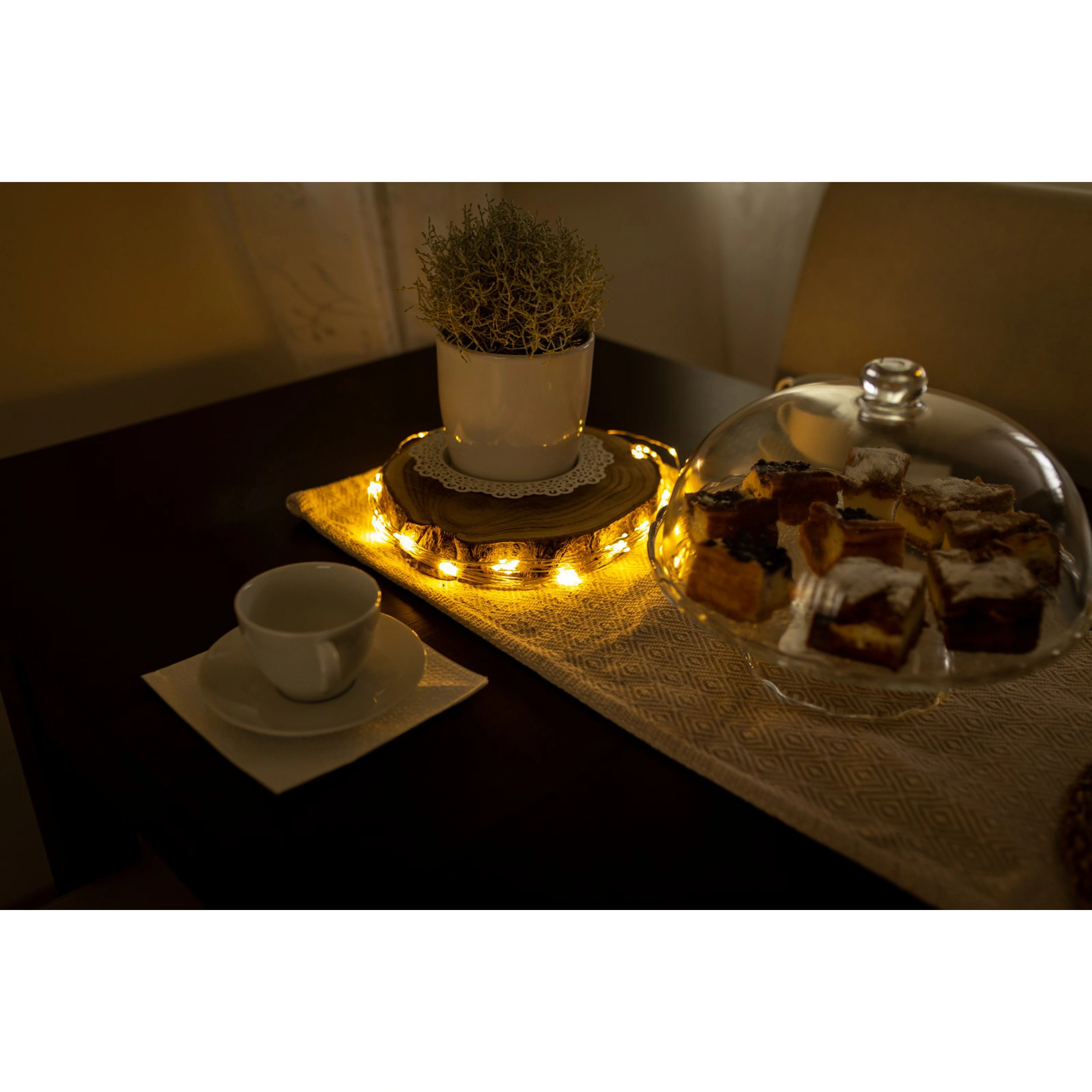 Teplá bílá barva osvětlení, bez světelných efektů - pouze svítí.