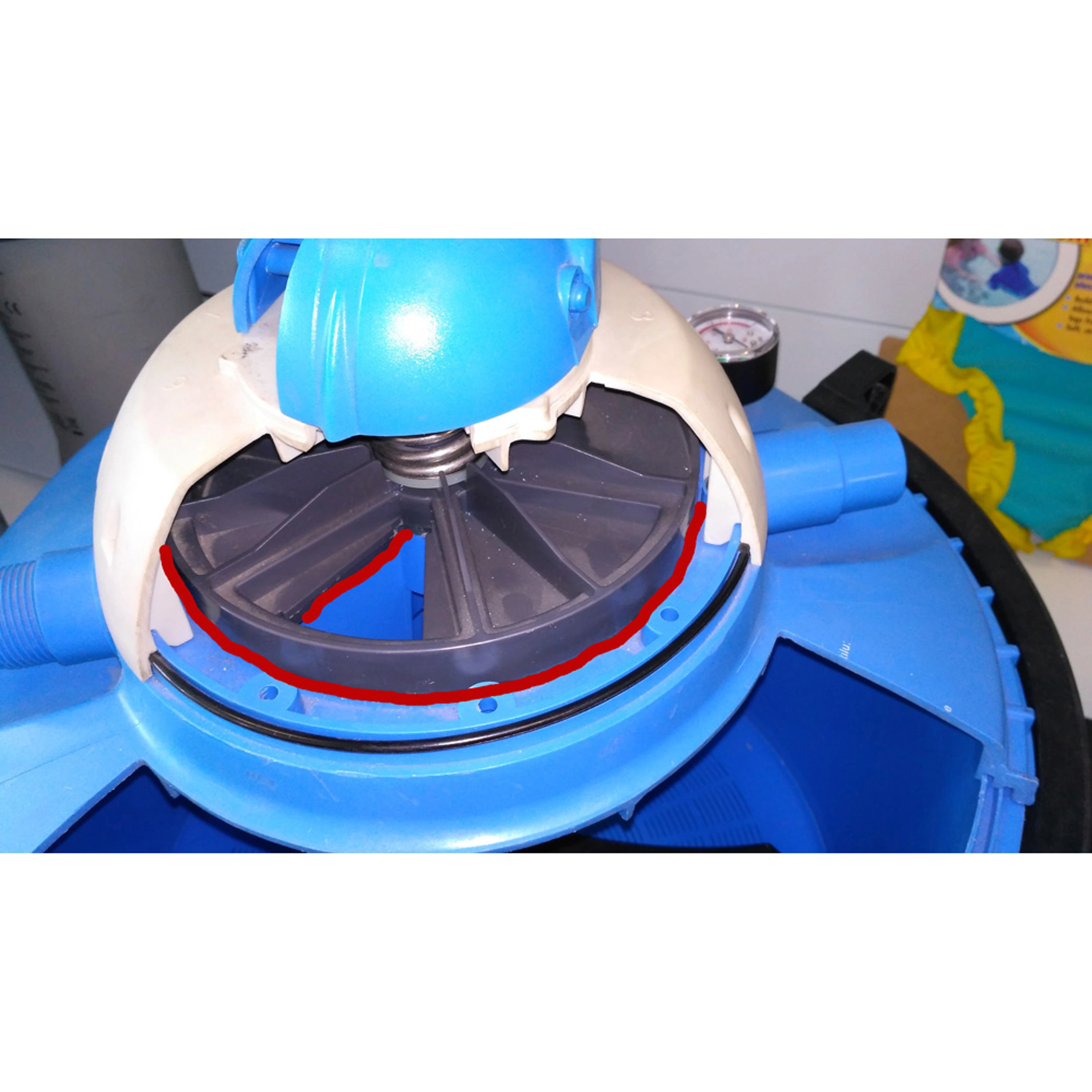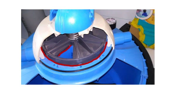 Náhradní těsnění rozdělovače v hlavě filtrace ProStar. Na fotografii řezu hlavou filtrace je umístění těsnění zvýrazněno červeně - jedná se o těsnění, které je uloženo pod tmavě šedým plastovým rozdělovačem.
