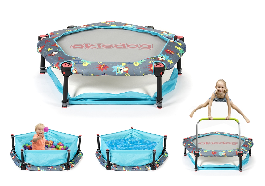 - multifunkční dětská sestava – trampolína, trampolíny s rukojetí, dětská ohrádka s balónky, bazének