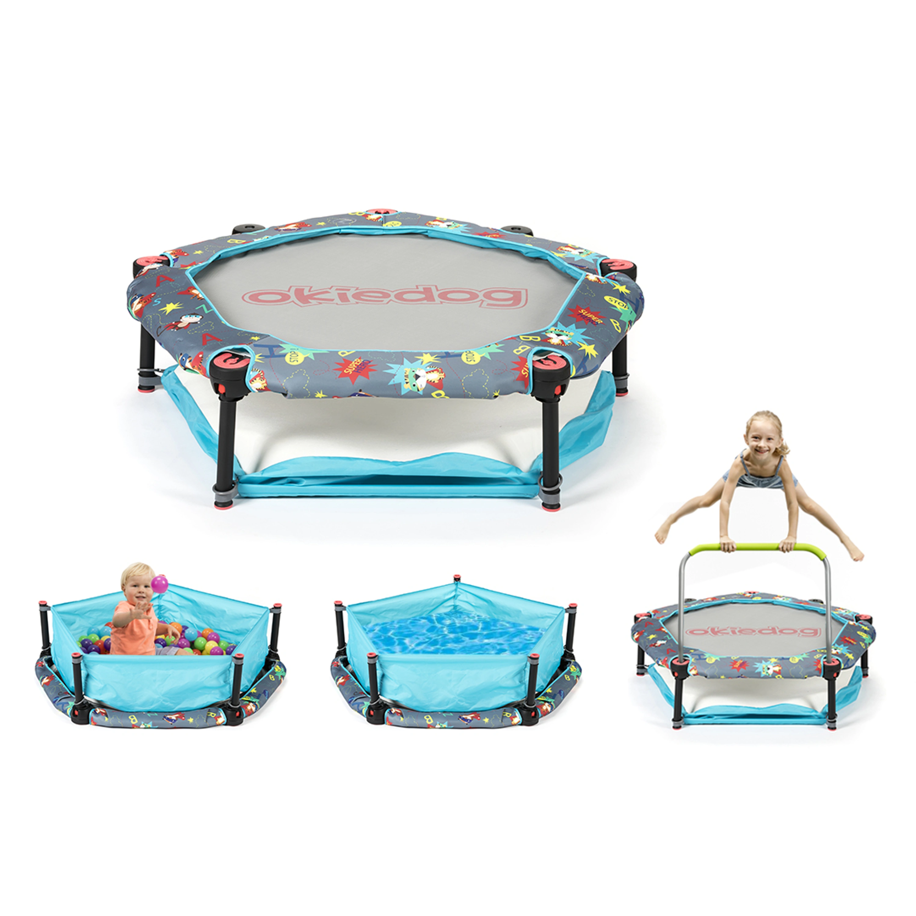 Tato multifunkční dětská sestava se může použít jako dětská ohrádka s balónky, bazének, nebo jako trampolína.
