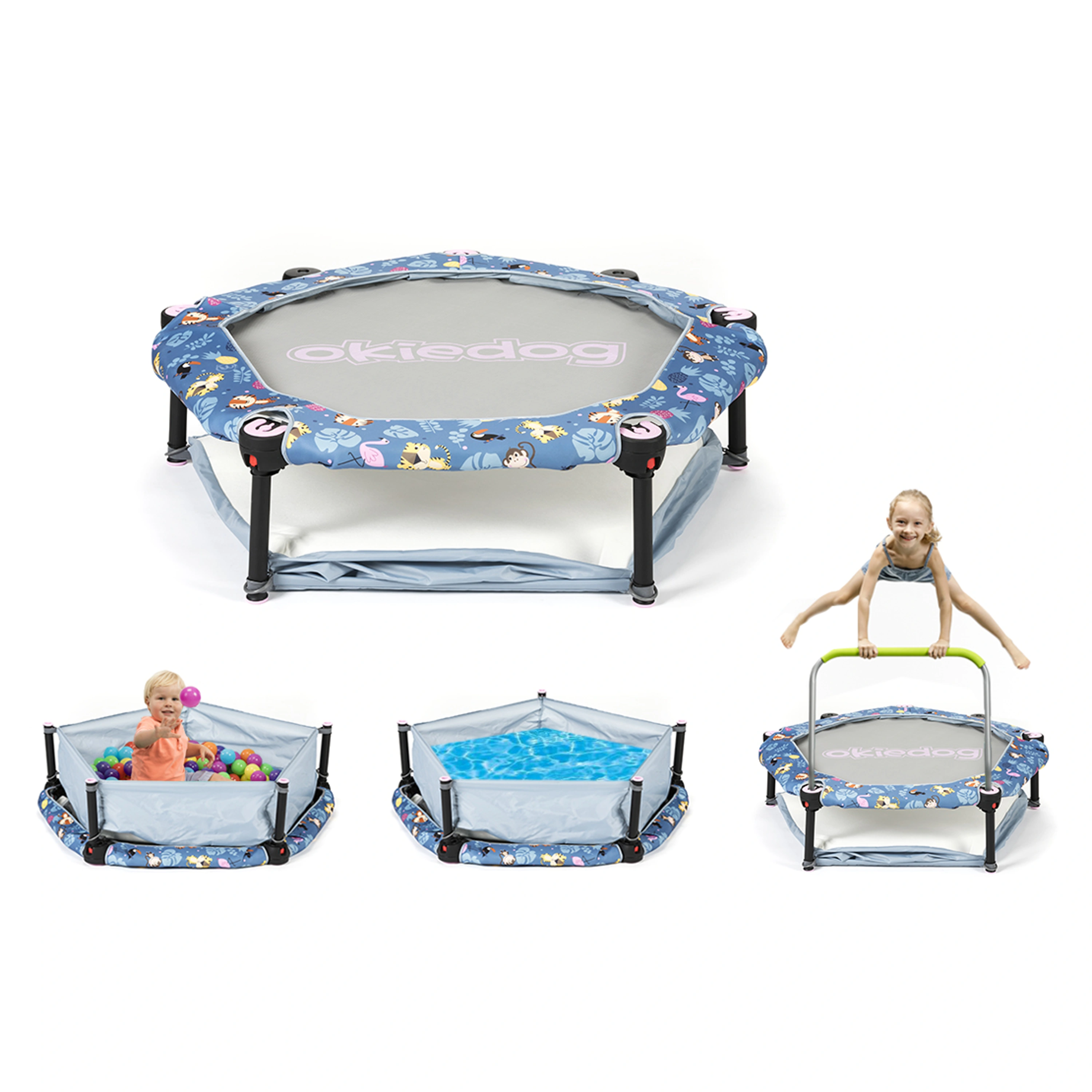 - multifunkční dětská sestava – trampolína, trampolíny s rukojetí, dětská ohrádka s balónky, bazének