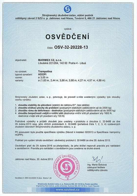Jako všechny naše trampolíny splňuje přísné bezpečností normy EN71 zkušebny AOV a prošla testem PAHs.
