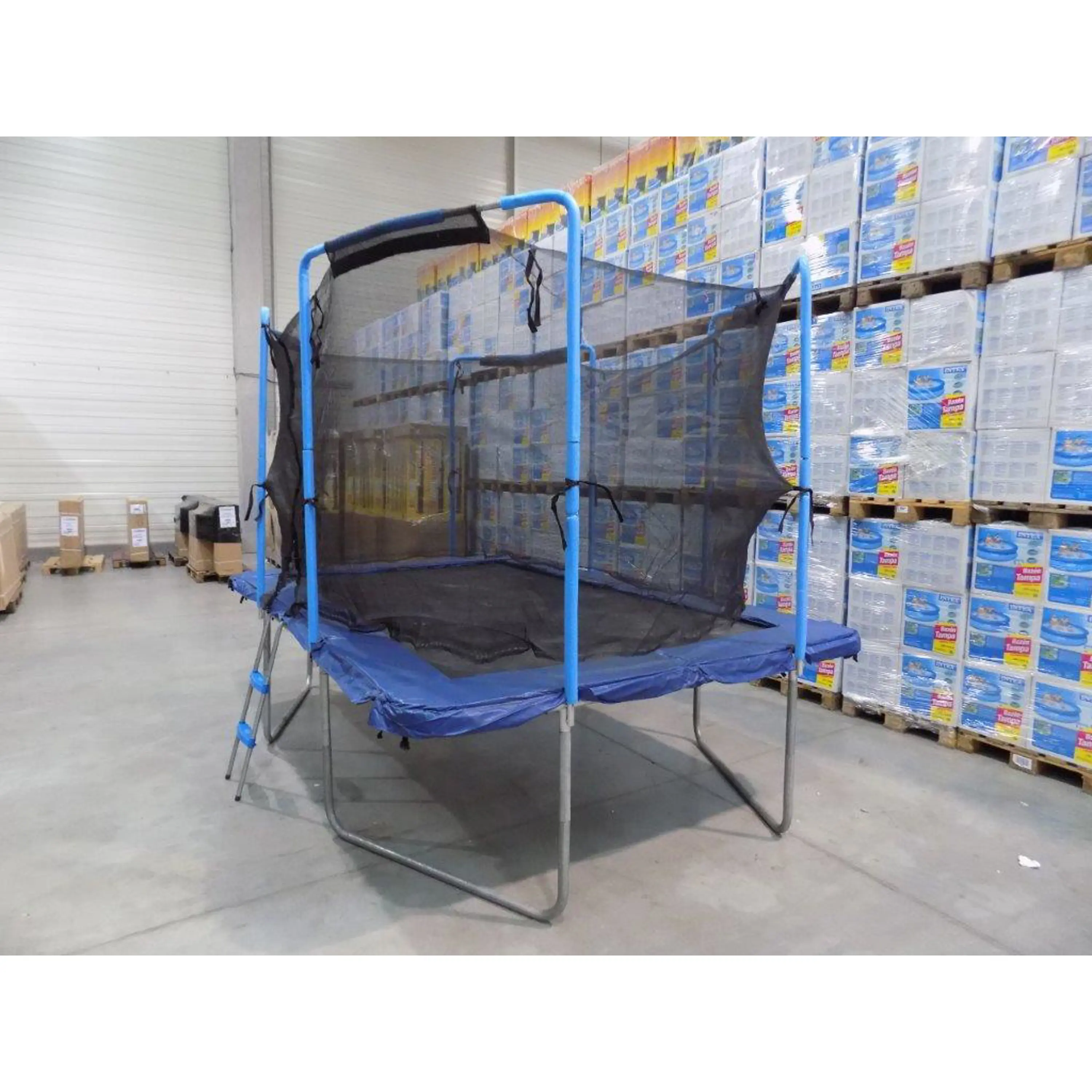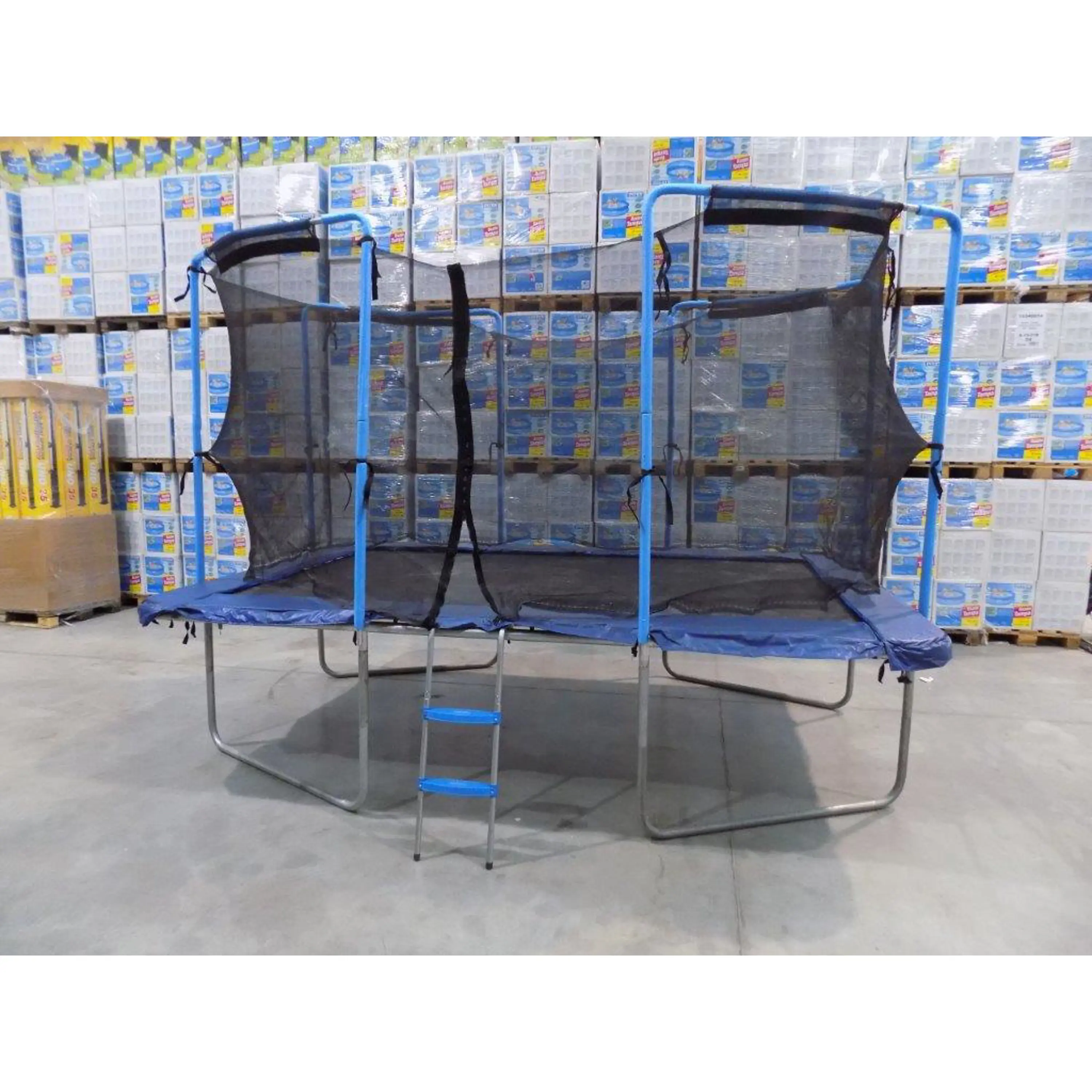 Vnější ochranná síť, jejíž tyče jsou spojeny s tyčemi nohou trampolíny, zajistí ještě více prostoru. Trampolína má navíc v balení kovový žebřík pro snadnější přístup na skákací plochu.