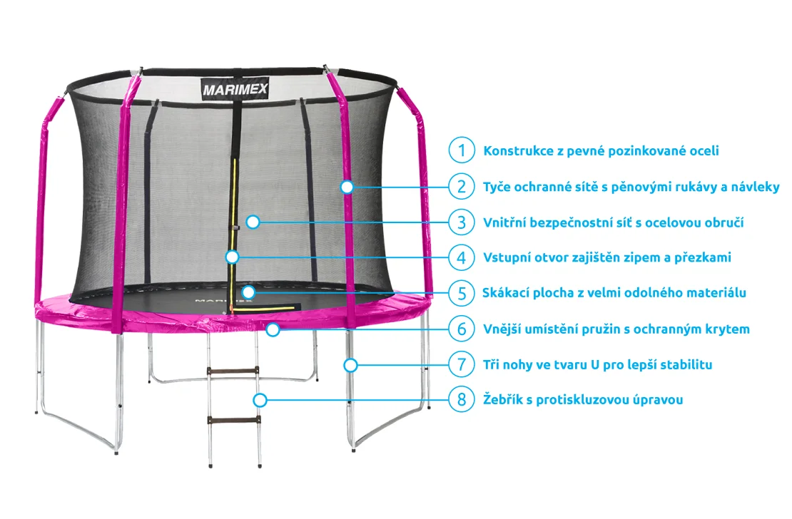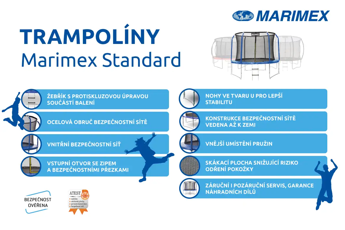 Trampolíny Marimex Standard jsou navrženy tak, aby poskytly maximální bezpečí při každém skoku. Stabilní konstrukce, ocelový rám s antikorozní úpravou, kvalitní pružiny a pevná skákací plocha tvoří dohromady spolehlivý celek, který vydrží i intenzivní používání. Díky promyšleným prvkům je trampolína vhodná jak pro děti, tak pro dospělé.