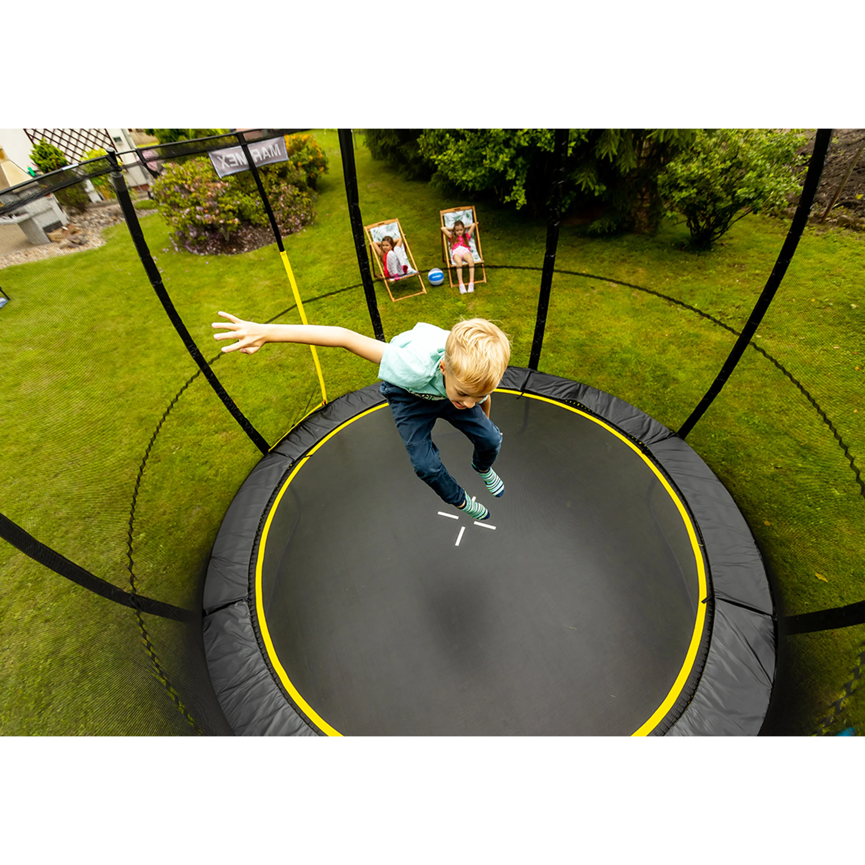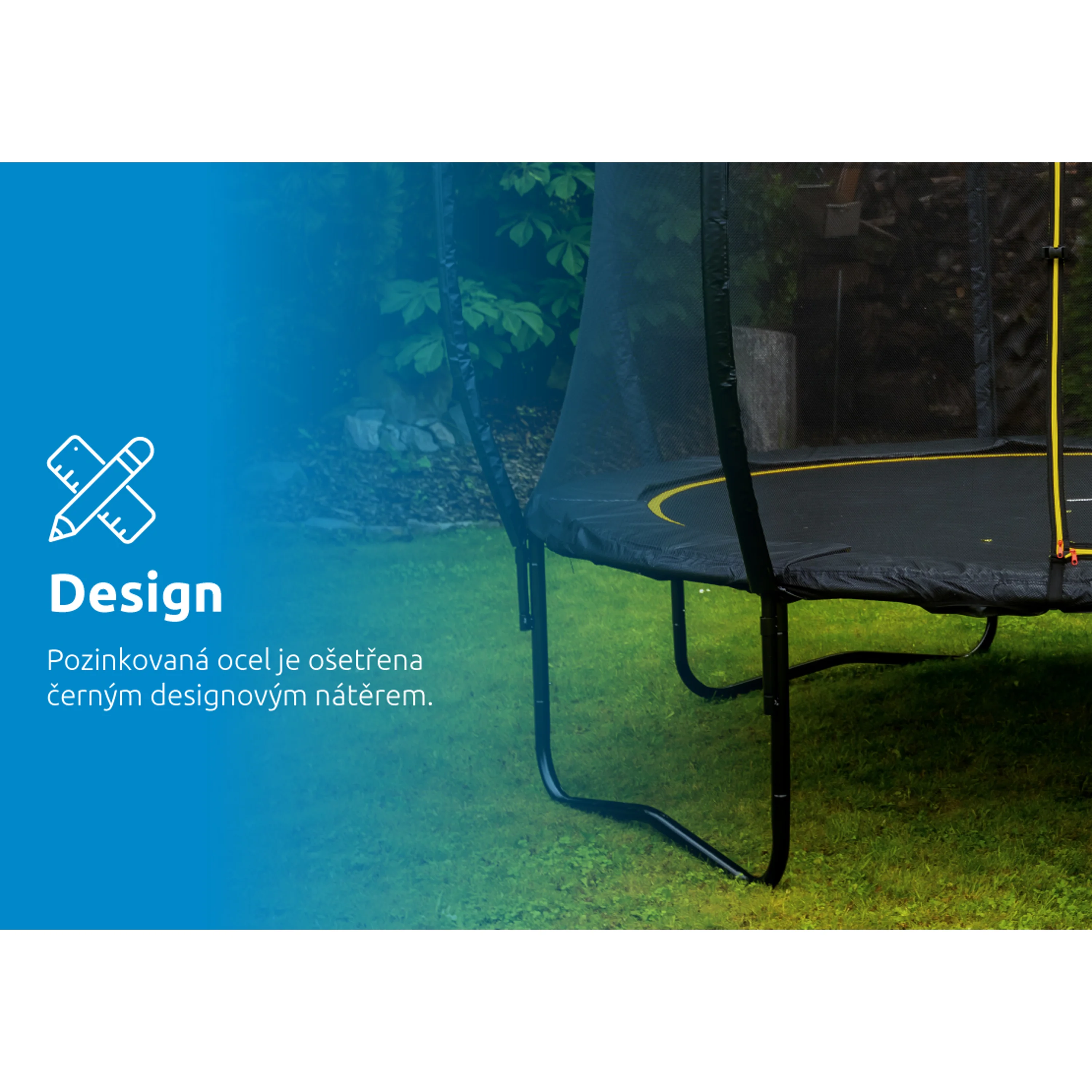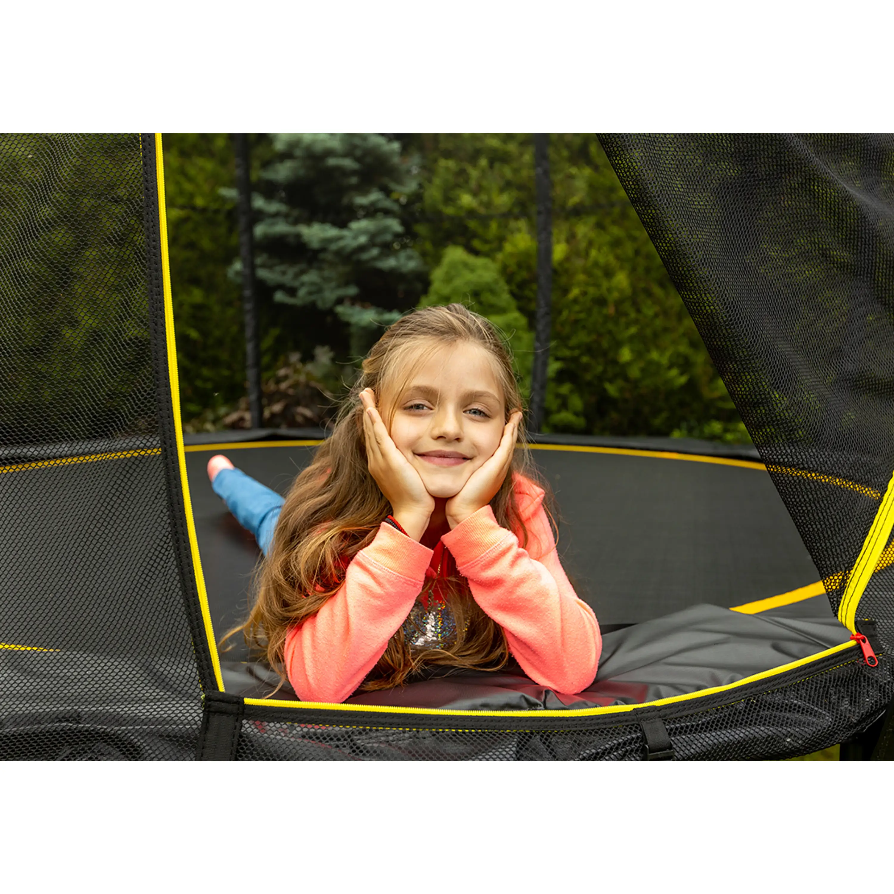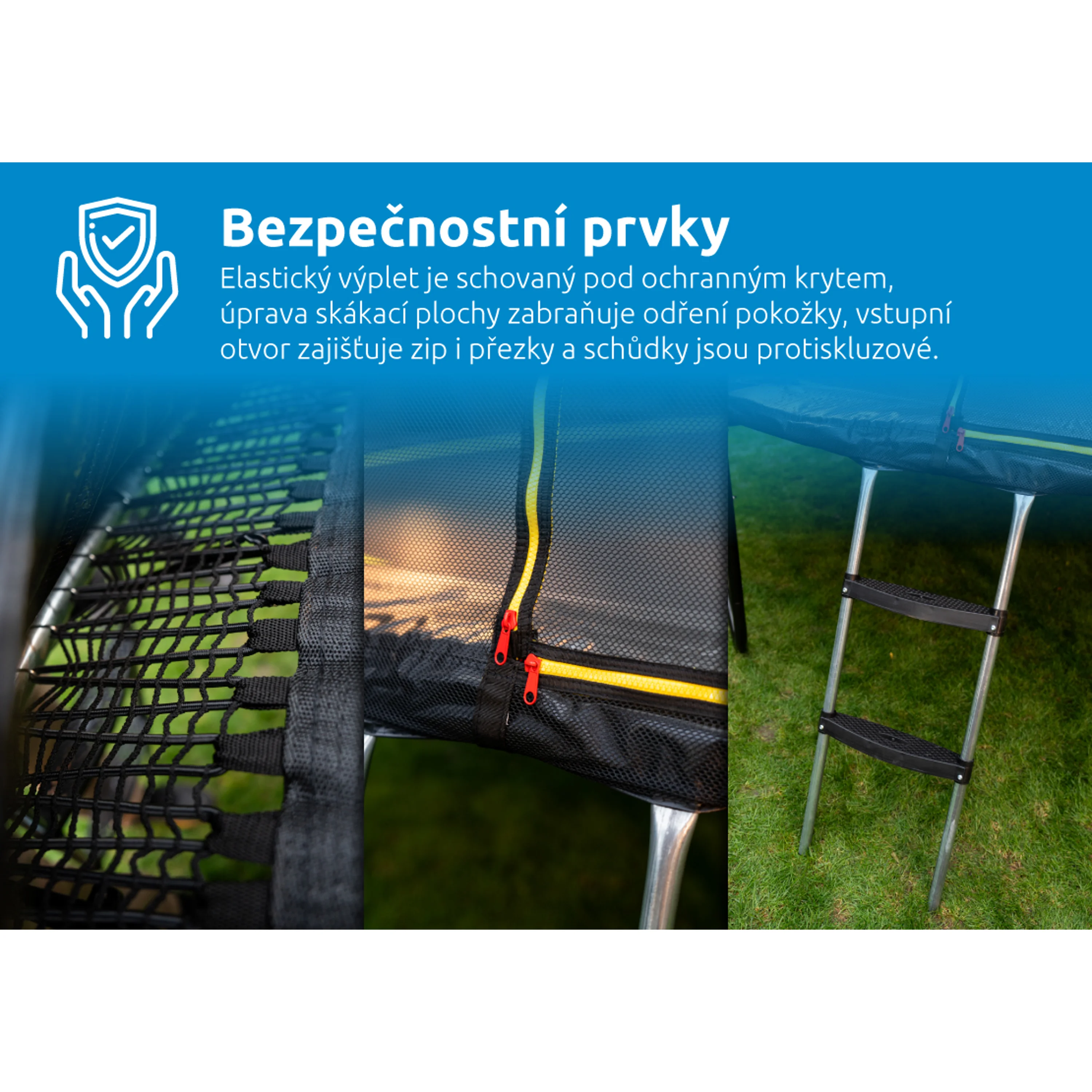 Trampolíny Comfort využívají elastický výplet namísto klasických pružin, což výrazně zvyšuje bezpečnost i pohodlí při skákání. Díky tomuto řešení je dopad měkčí, odrazová plocha flexibilnější a nehrozí riziko skřípnutí či kontaktu s kovovými pružinami. Elastický výplet je navíc skrytý pod ochranným krytem, který brání vniknutí nohy a vytváří jednotný, bezpečný prostor pro děti i dospělé.