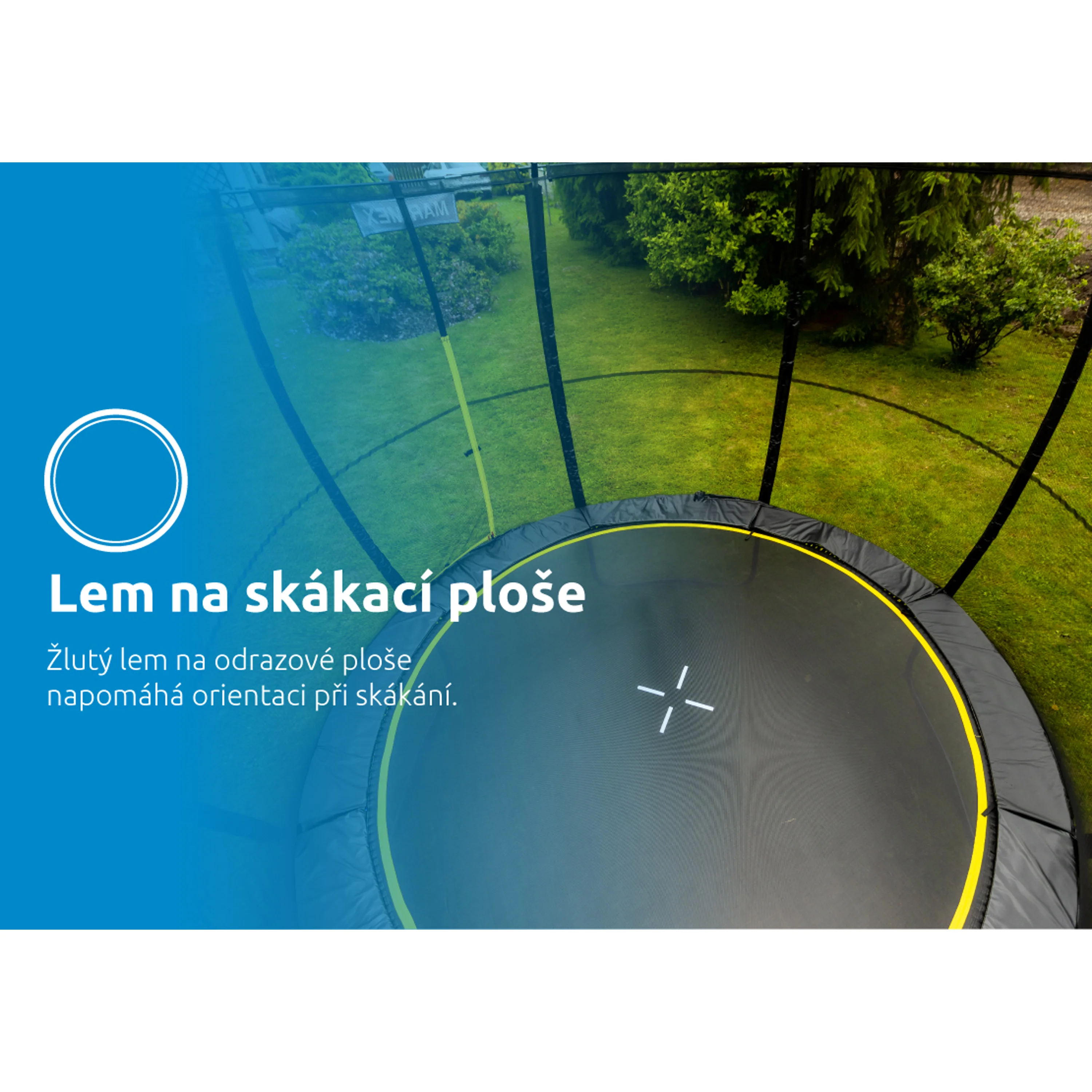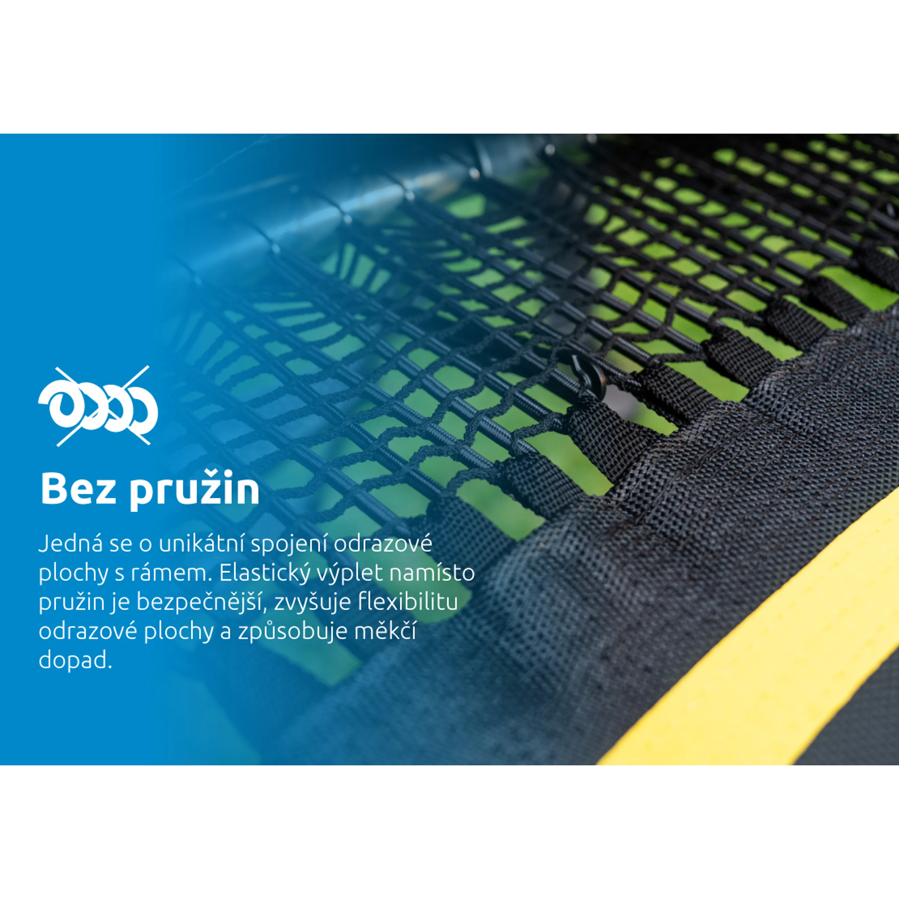 Bez pružinNová technologie upevnění skákací plochy do rámu. Elastický výplet namísto pružin je bezpečnější, zvyšuje flexibilitu odrazové plochy a způsobuje měkčí dopad |
