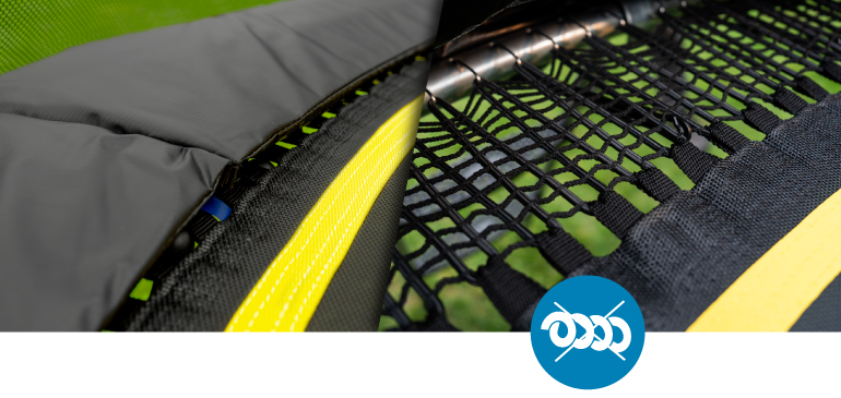 Bez pružinNová technologie upevnění skákací plochy do rámu. Elastický výplet namísto pružin je bezpečnější, zvyšuje flexibilitu odrazové plochy a způsobuje měkčí dopad |