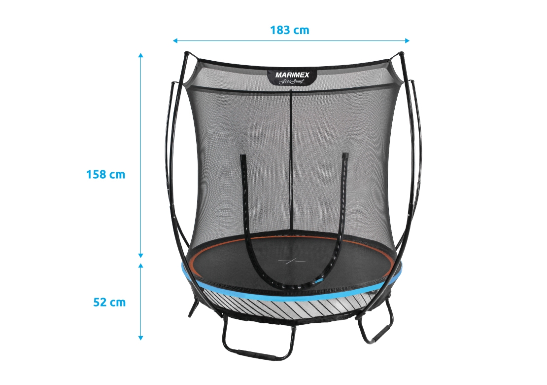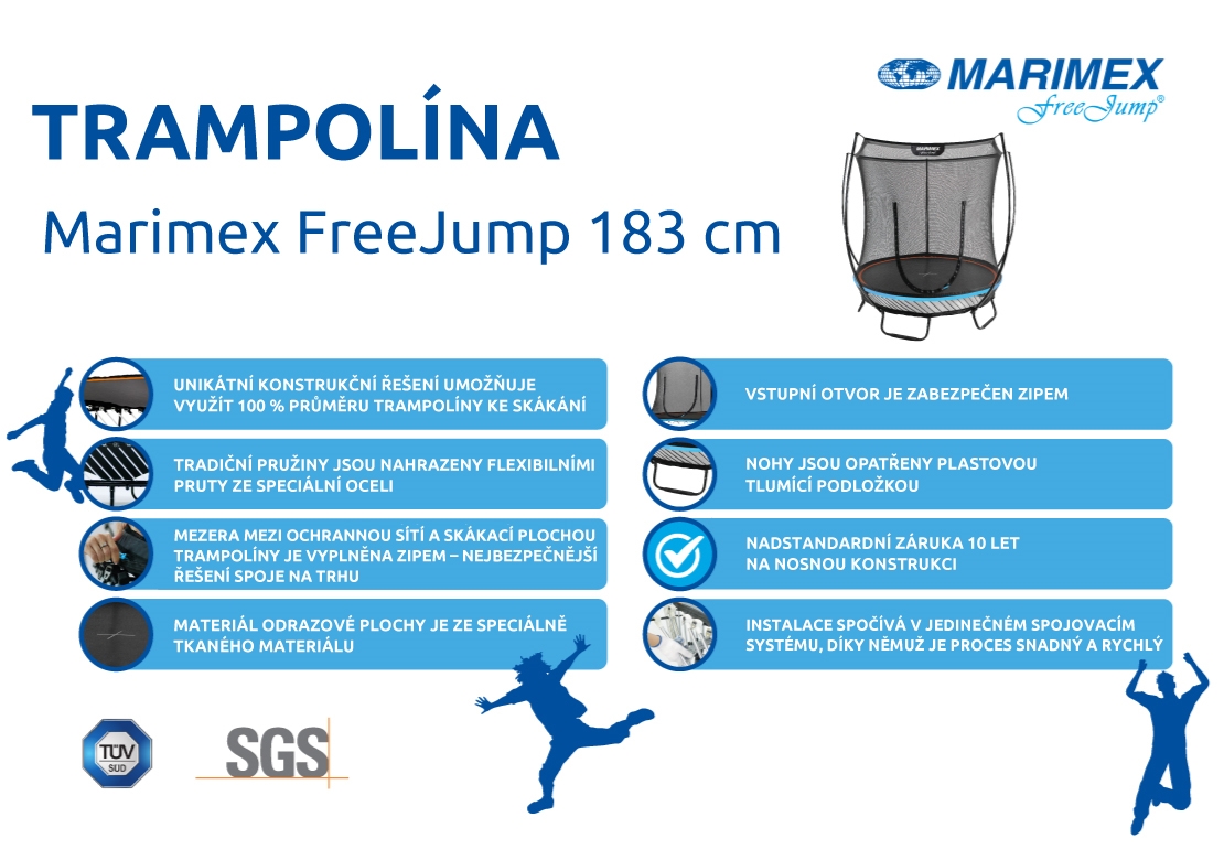Trampolína Marimex FreeJump je nová prémiová řada. Bezpečnostní síť je pevně spojená se skákací plochou. Tradiční pružiny jsou nahrazeny flexibilními pruty ze speciální oceli, která vyniká vysokou mírou houževnatosti. Výhodou je i nadstandardní záruka 10 let na nosnou konstrukci a 3 roky na odrazovou plochu a síť.