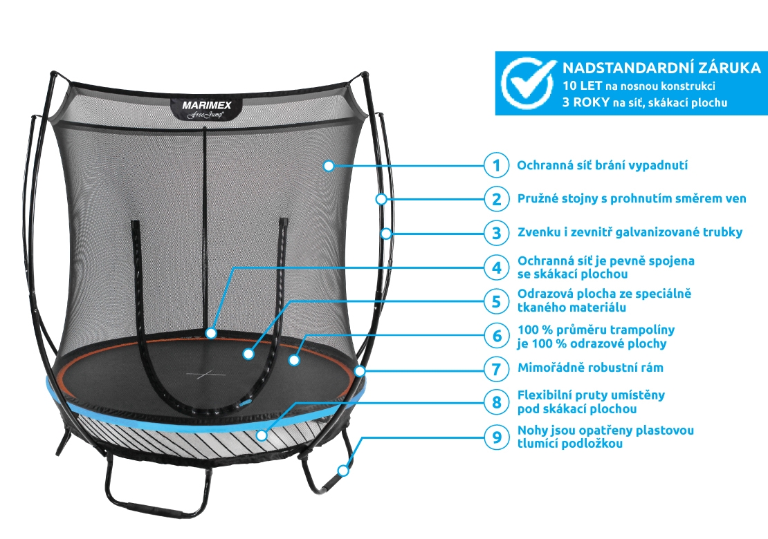 - Nadstandardní záruka 10 let na nosnou konstrukci a 3 roky na odrazovou plochu a síť