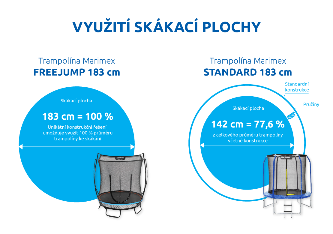100 % průměru trampolíny = 100 % skákací plochy. Unikátní konstrukční řešení umožňuje využít 100 % průměru trampolíny ke skákání, a to při zachování vysokých nároků na bezpečnost a stabilitu. Pružící systém je umístěn pod skákací plochou trampolíny. Materiál odrazové plochy je ze speciálně tkaného materiálu. Skákací plocha byla testována na 3 miliony rázů.
