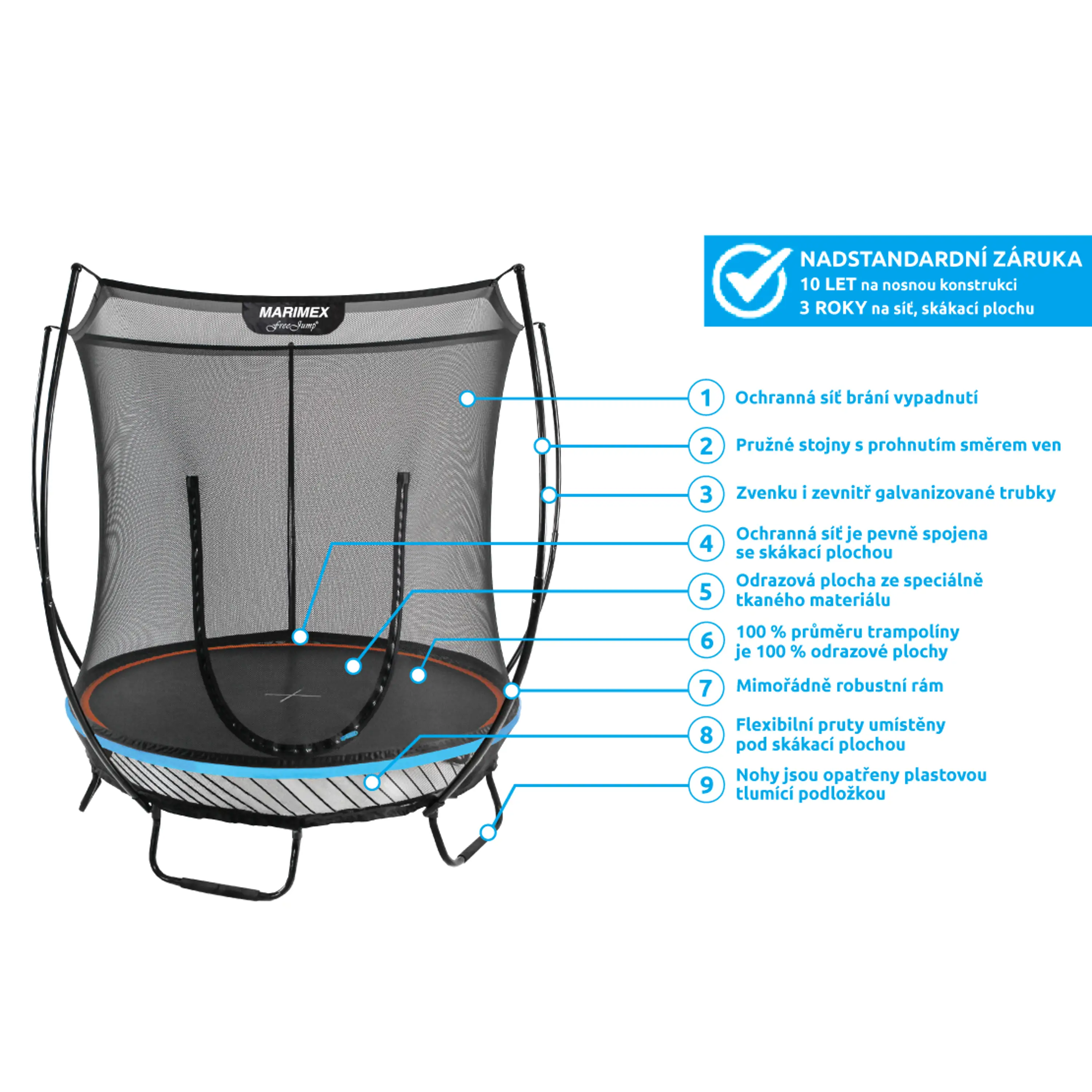 - Nadstandardní záruka 10 let na nosnou konstrukci a 3 roky na odrazovou plochu a síť