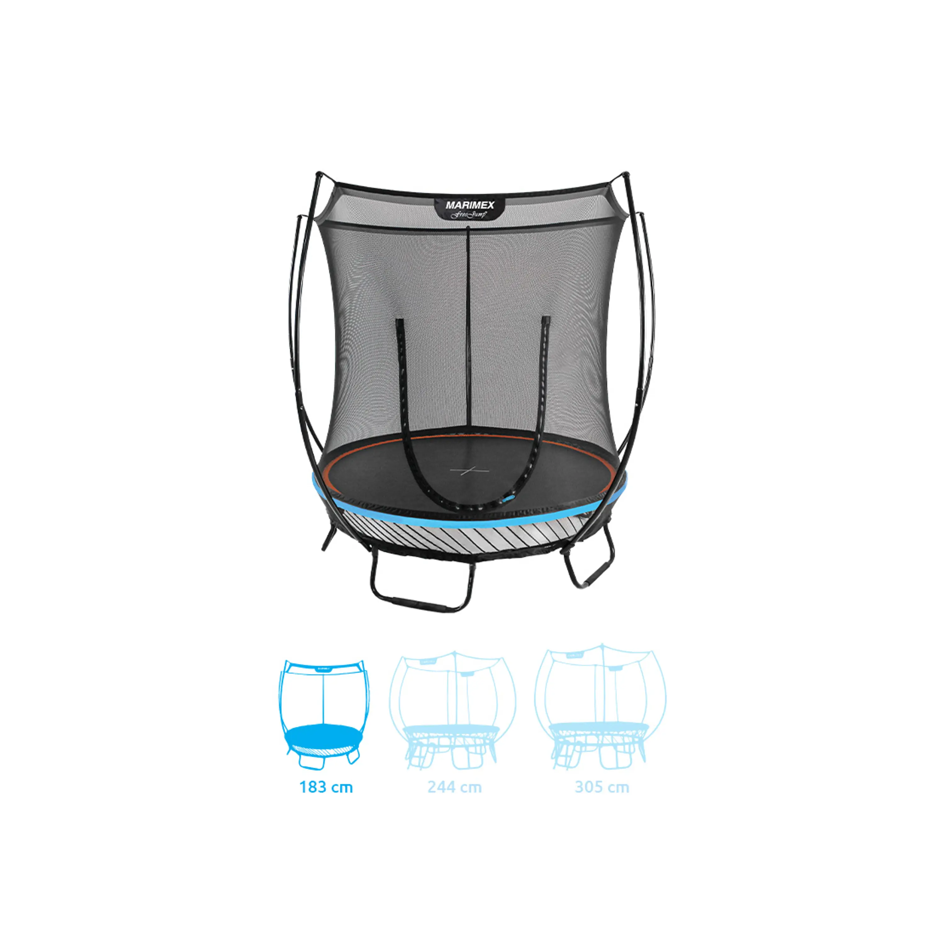 Trampolína Marimex FreeJump je nová prémiová řada. Bezpečnostní síť je pevně spojená se skákací plochou. Tradiční pružiny jsou nahrazeny flexibilními pruty ze speciální oceli, která vyniká vysokou mírou houževnatosti. Výhodou je i nadstandardní záruka 10 let na nosnou konstrukci a 3 roky na odrazovou plochu a síť.
