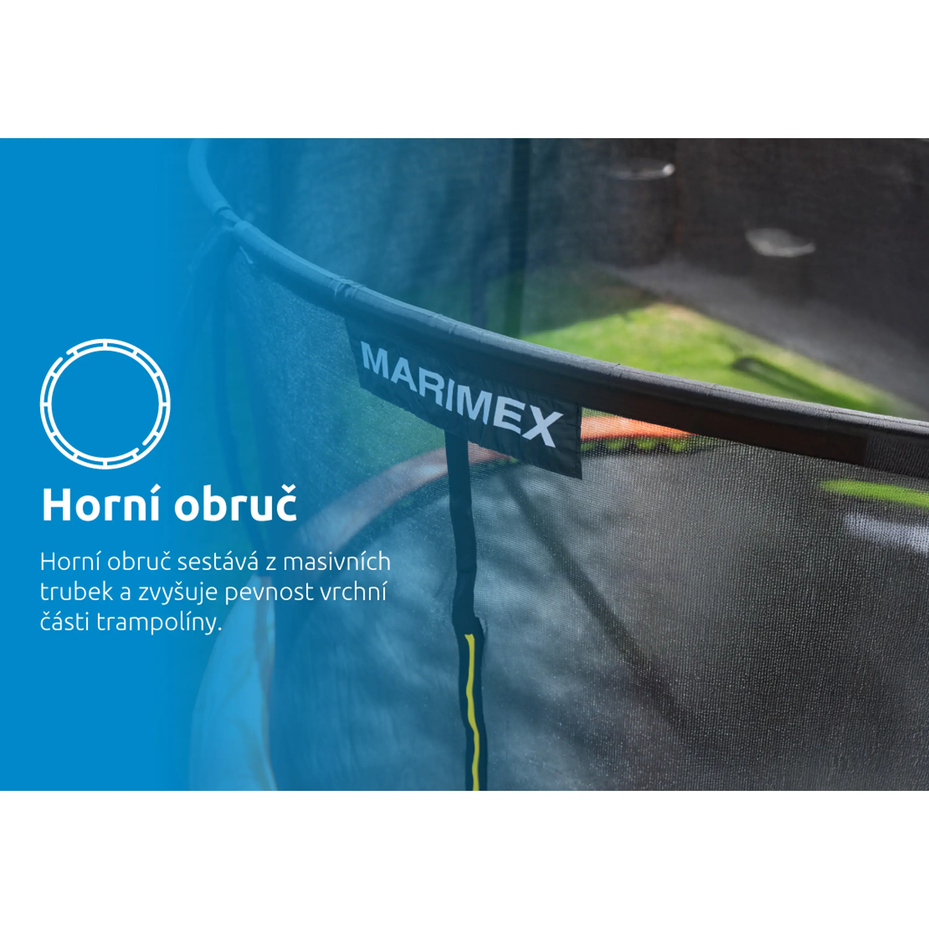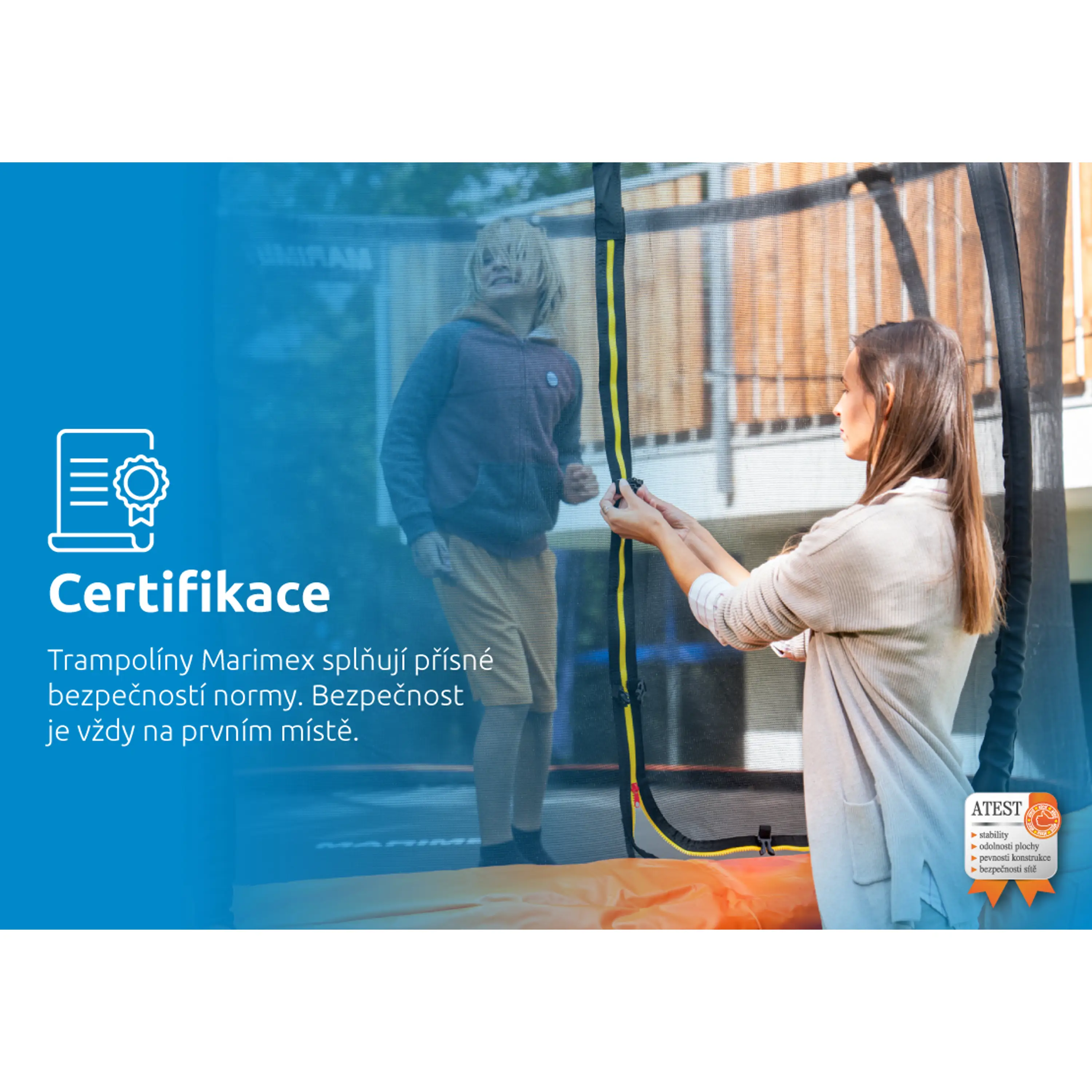 Prémiová řada se vyznačuje elipsovitým tvarem stojen, který spolu s polstrovanými návleky výrazně snižuje riziko kontaktu s rámem. Klíčovým prvkem je také vnitřní ochranná síť bránící vypadnutí mimo skákací plochu a zamezující šlápnutí do oblasti pružin. Bezpečnost zvyšuje i řada dalších detailů, jako pružiny skryté pod ochranným krytem, protiskluzové schůdky, úprava skákací plochy zabraňující odření pokožky i vstup zajištěný pomocí zipu a přezek. Každá část konstrukce je navržena s důrazem na bezpečnost, která je pro Marimex absolutní prioritou. S tím souvisí i splnění přísných bezpečnostních norem.
