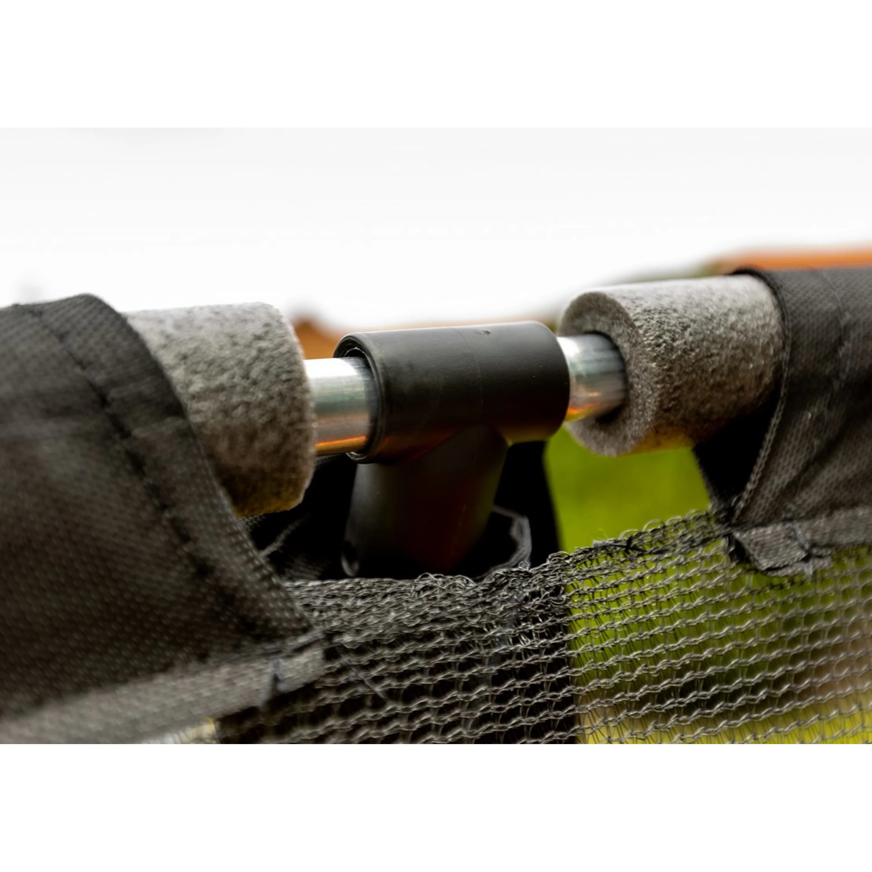 - Horní obruč trampolíny spojena se stojnami pomocí T-spojů; T-spoje přispívají ke stabilitě trampolíny a snazší montáži