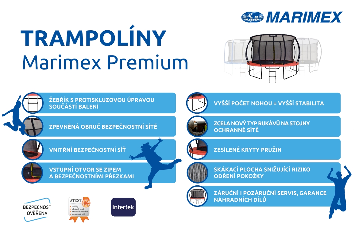 Trampolíny Marimex Premium nevynikají pouze novým designem a barevností, ale také větší stabilitou, pevností a bezpečností. Zvýšené stability trampolín Marimex Premium je dosaženo pomocí vyššího počtu nohou. Bezpečnost zajišťují zesílené ochranné kryty pružin a nová technologie T-spojů. Vnitřní ochrannou síť podpírá osm dynamicky prohnutých tyčí a napnutou ji drží zpevněná horní obruč. Skákací plocha je vyrobena z velmi odolného a neabrazivního materiálu s vysokou životností.