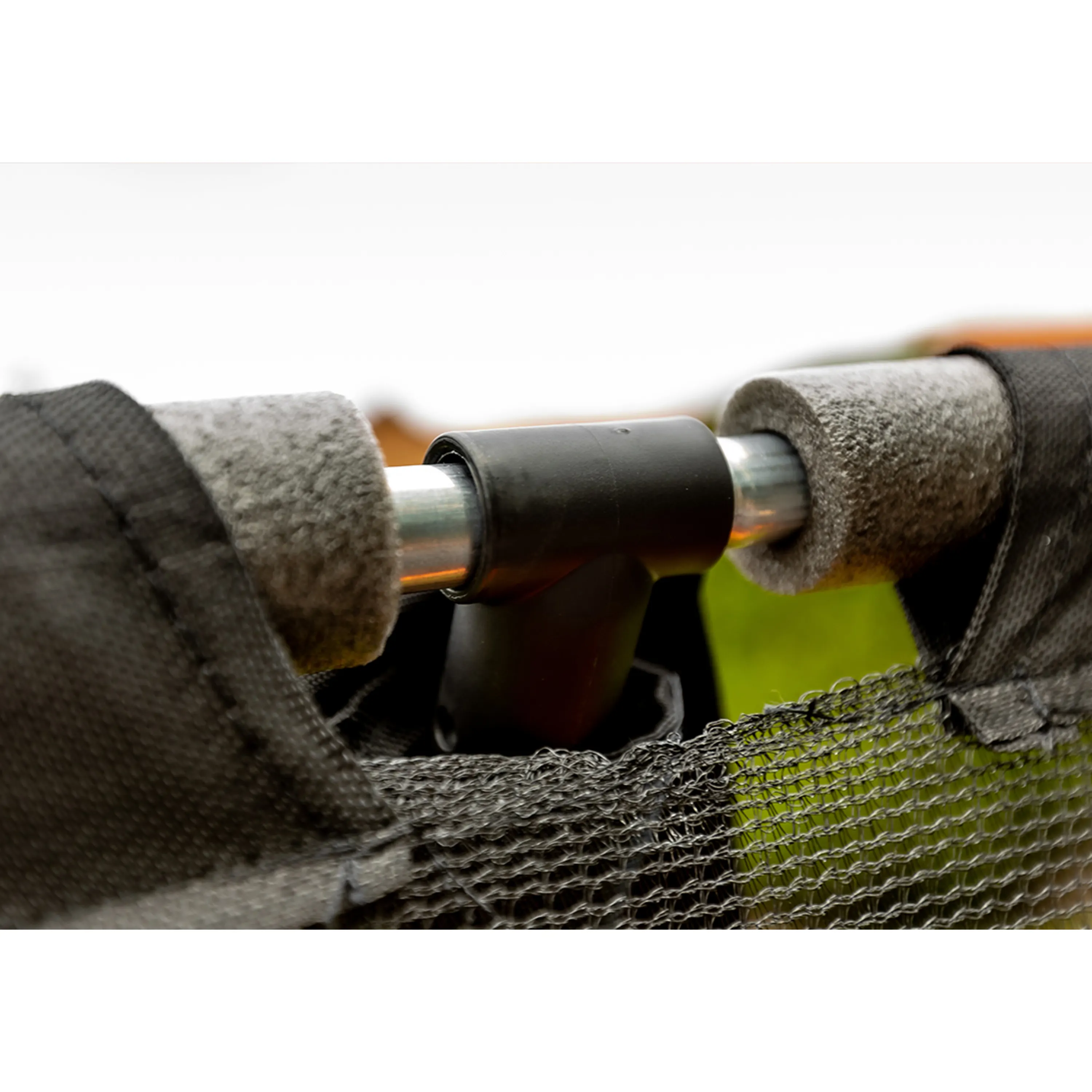 • Horní obruč trampolíny spojena se stojnami pomocí T-spojů; T-spoje přispívají ke stabilitě trampolíny a snazší montáži
