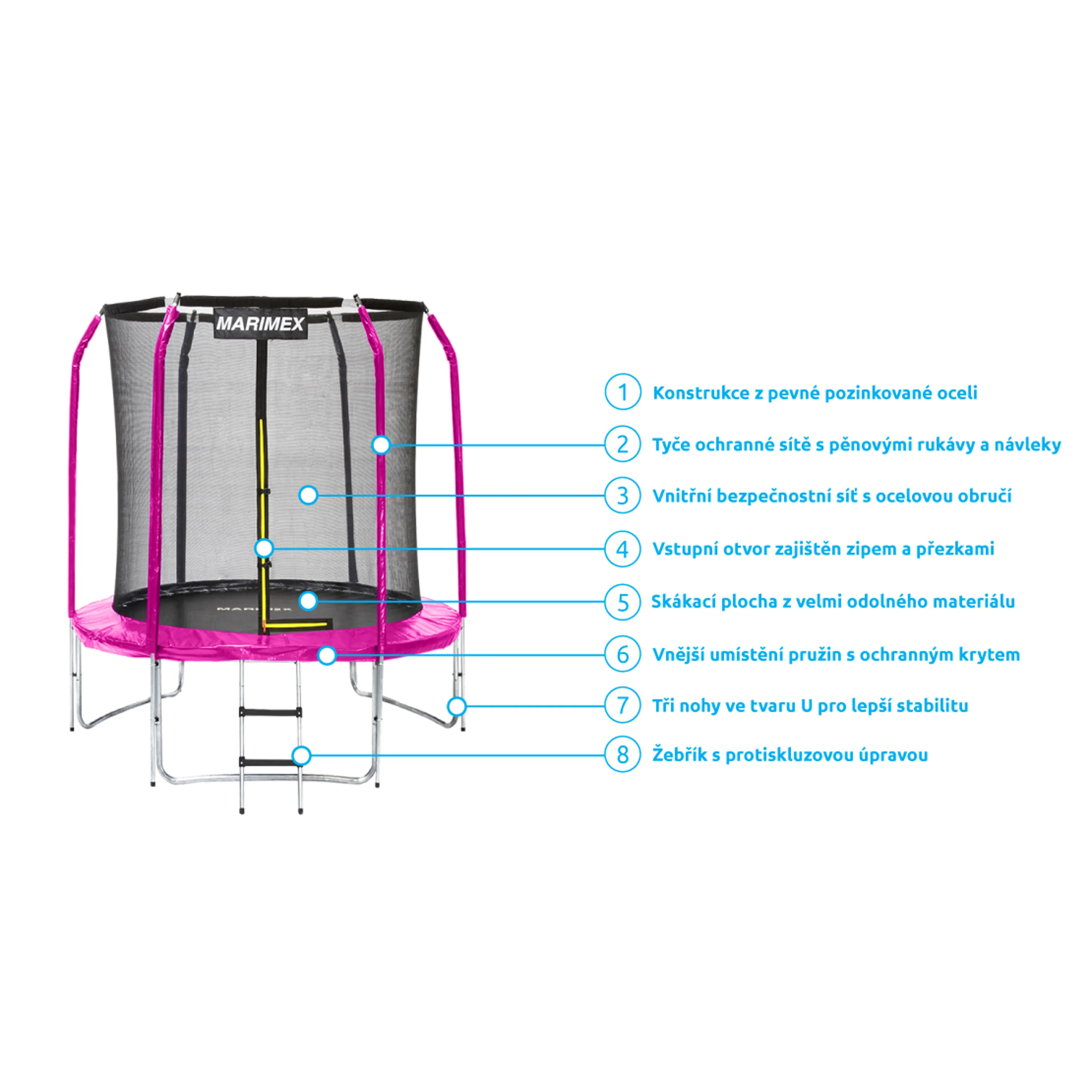 Vnitřní ochrannou síť najdete přímo v balení, nemusíte si ji dokupovat zvlášť. Vnitřní ochranná síť je bezpečnější než vnější síť - brání přístupu skákajícího do části s pružinami. Vstupní prostor je zajištěn třemi přezkami a brání vypadnutí. Tyče jsou obaleny ochranným návlekem z měkčené pěny. Nohy trampolíny jsou samostatné a zvyšují stabilitu celé trampolíny. Spojení tyčí nohou trampolíny a sítě je jištěno speciálními sponami.