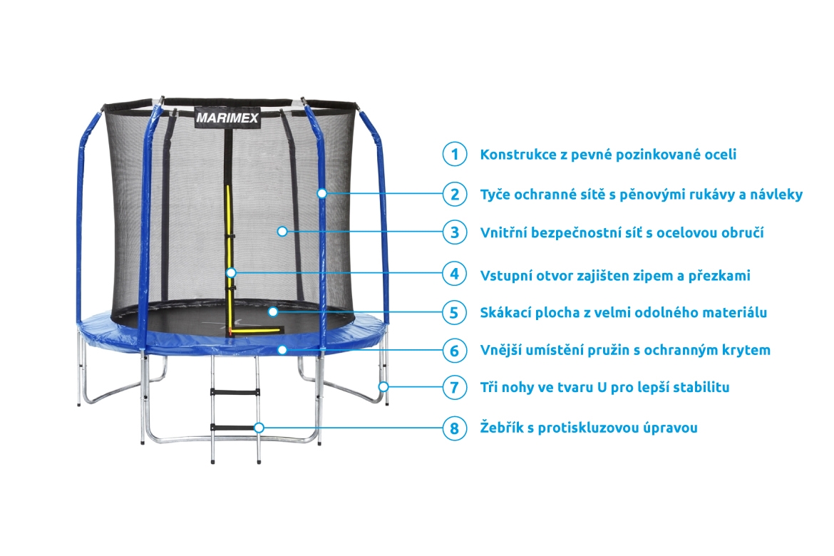 Nejmenší trampolína Marimex z řady Standard je skvělým doplňkem každé zahrady. Děti skákání na trampolíně milují a při skákání si snadno zacvičí i dospělí - nosnost je až 50 kg. Dokonalou stabilitu zajišťují tři nohy ve tvaru písmene U.