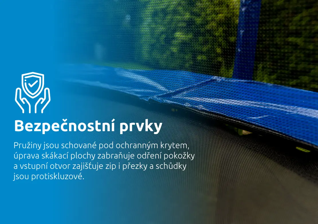 Součástí trampolín řady Standard je vnitřní ochranná síť, jež výrazně zvyšuje bezpečnost při skákání. Eliminuje riziko pádu mimo trampolínu, kontakt s rámem a vniknutí nohy do prostoru pružin. Síť vypíná horní obruč z ocelových prutů, která udržuje tvar trampolíny a zajišťuje pevnost její vrchní části. Vstupní otvor v síti se snadno uzavírá zipem a přezkami. Jedinečná úprava skákací plochy zabraňuje odření pokožky a schůdky, které trampolínu doplňují, jsou pevné, stabilní a protiskluzové.