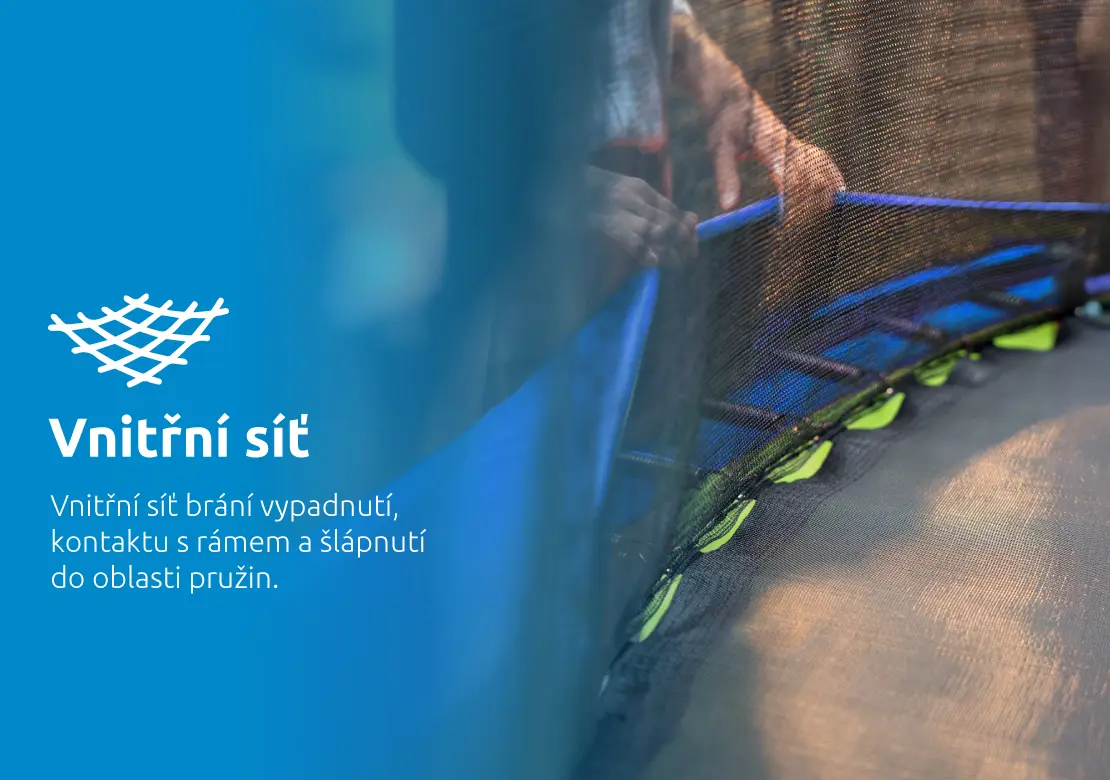 Vnitřní ochranná síťVýjimečnost vnitřní ochranné sítě spočívá v umístění v těsné blízkosti skákací plochy. Brání vypadnutí, kontaktu s rámem a šlápnutí do oblasti pružin. |