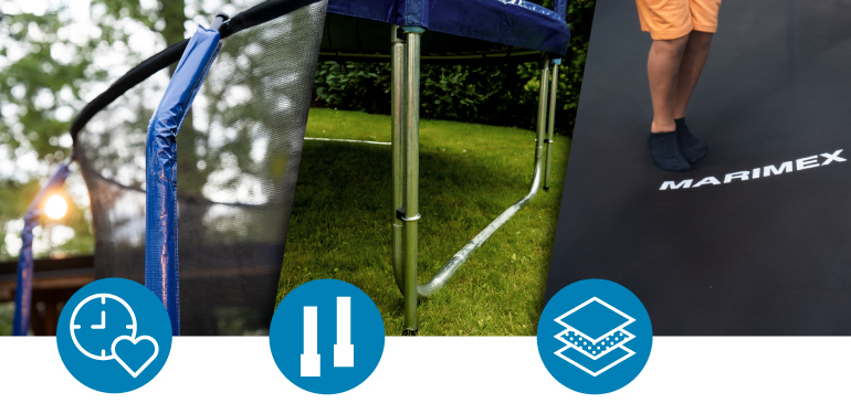 Trampolíny Marimex Standard jsou navrženy tak, aby poskytly maximální bezpečí při každém skoku. Stabilní konstrukce, ocelový rám s antikorozní úpravou, kvalitní pružiny a pevná skákací plocha tvoří dohromady spolehlivý celek, který vydrží i intenzivní používání. Díky promyšleným prvkům je trampolína vhodná jak pro děti, tak pro dospělé.