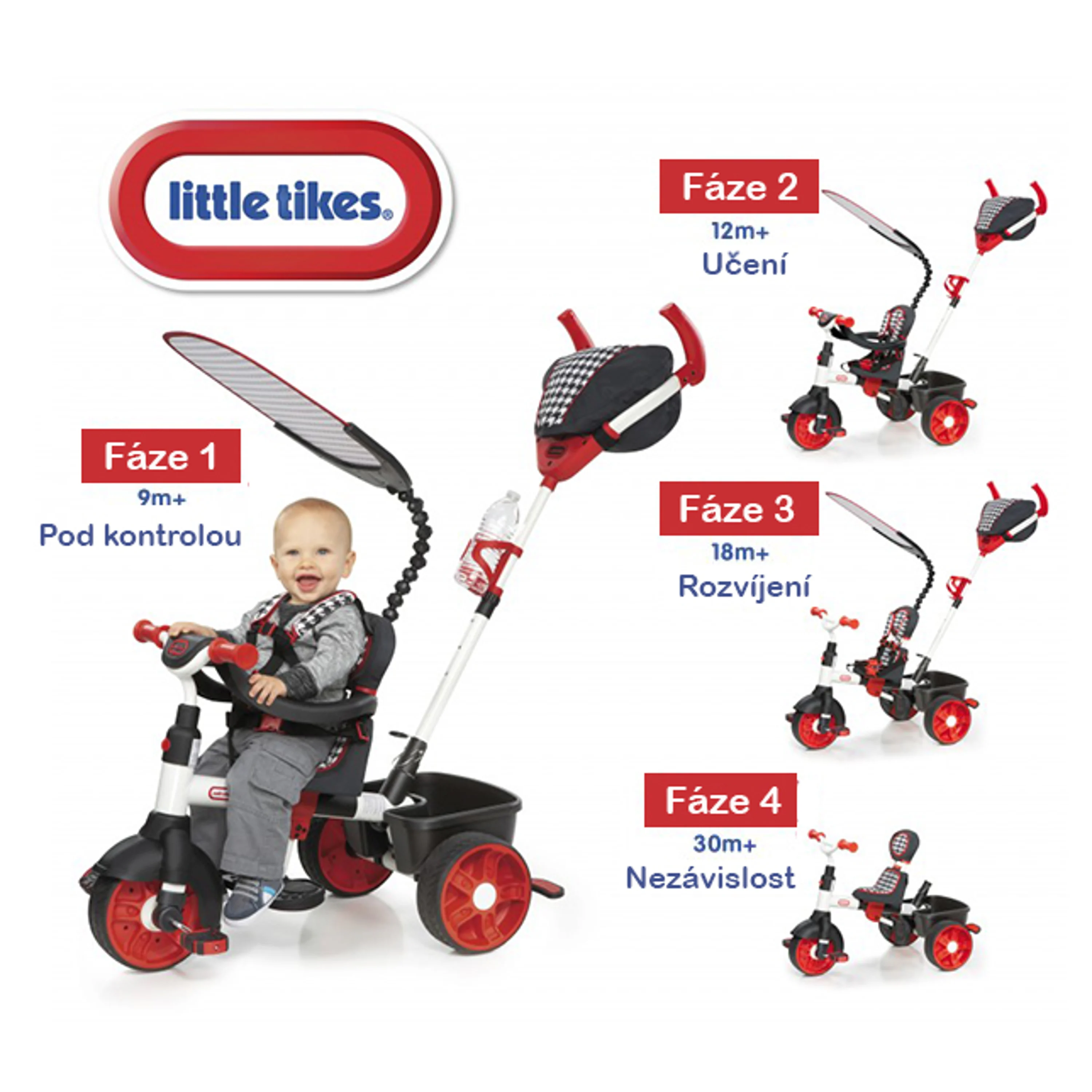 Tato tříkolka může být upravena v závislosti na vývoji Vašeho dítěte: vedené (9+ měsíců), učící se (12+ měsíců), ve vývinu (18+ měsíců), nezávislé (30+ měsíců). Opěrky nohou mohou být složeny, bezpečnostní závora a výsuvná tyč jsou odnímatelné.