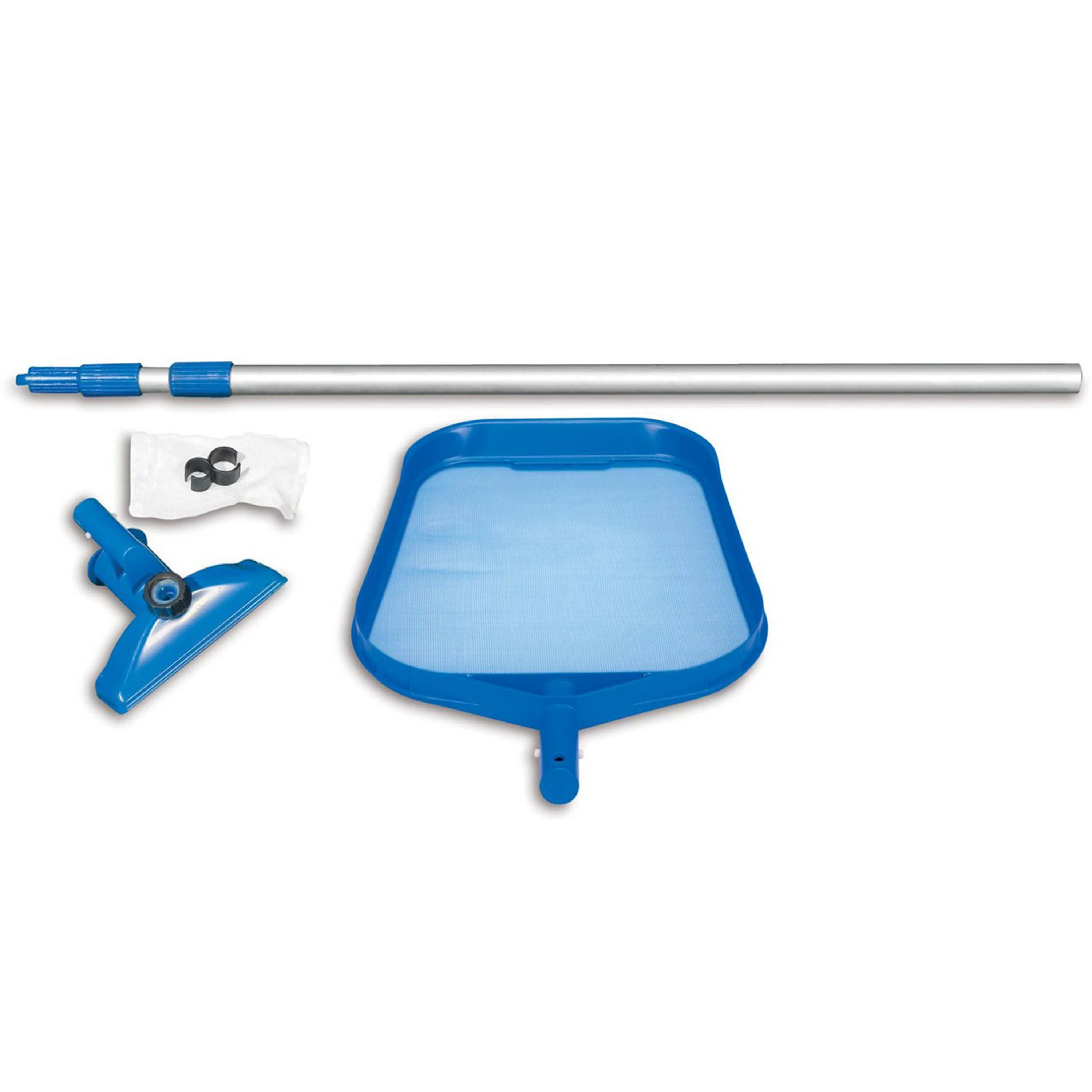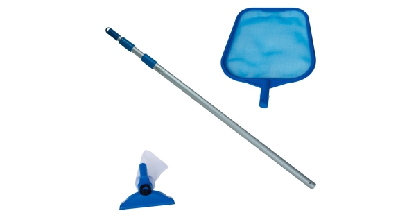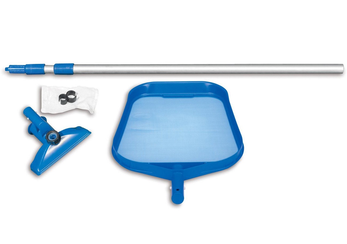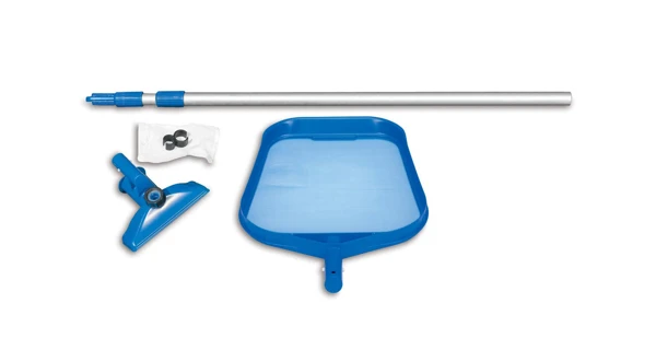 Sada pro údržbu bazénu. Sada tří částí čistícího setu je určena pro údržbu bazénu. Není potřebné napojení na filtrační pumpu, stačí napojení na zahradní hadici, nečistoty putují do nylonového sáčku. Set je ale možné napojit i na filtraci.
