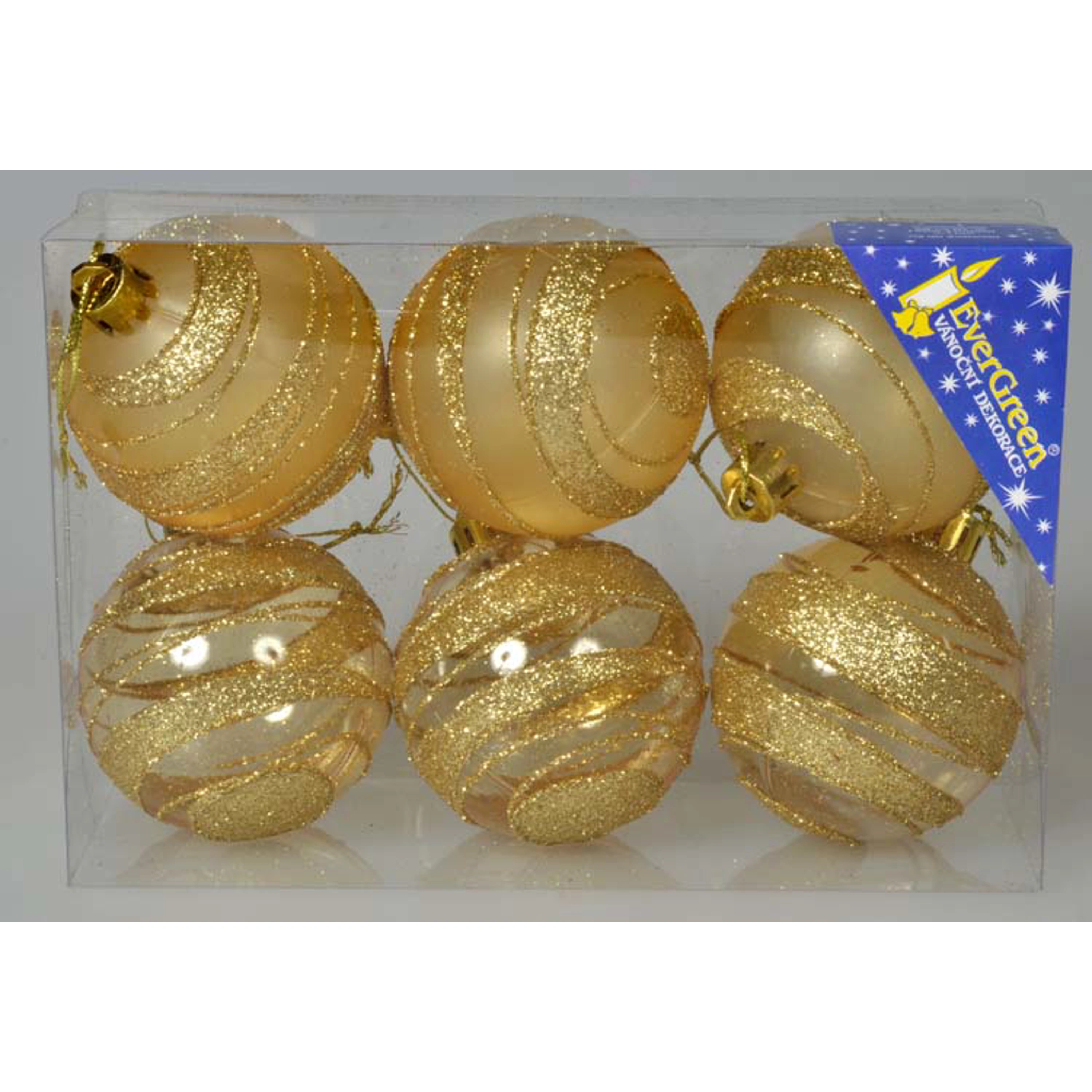 Sada vánočních ozdob obsahuje 3 lesklé a 3 matné vánoční koule ve zlatém designu.