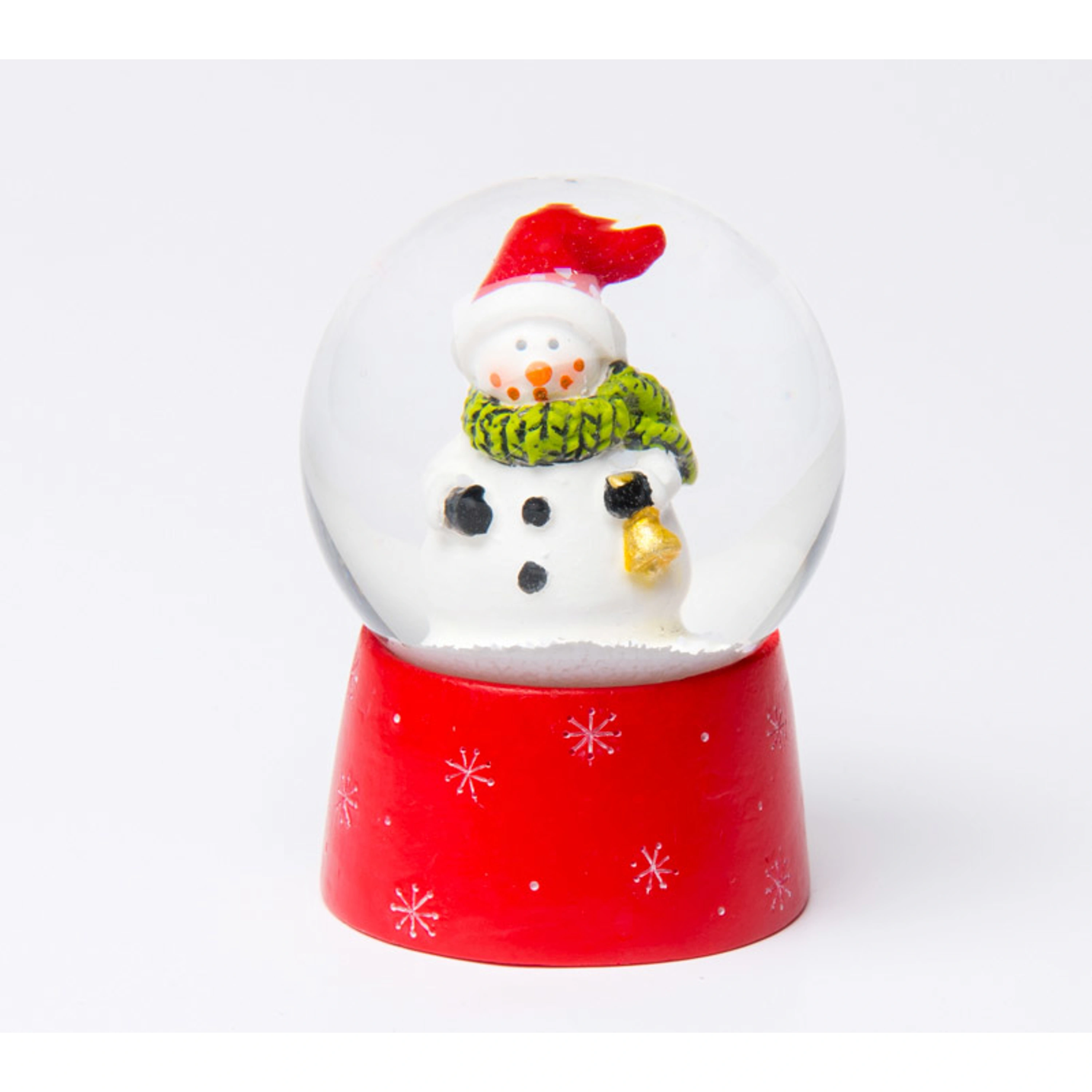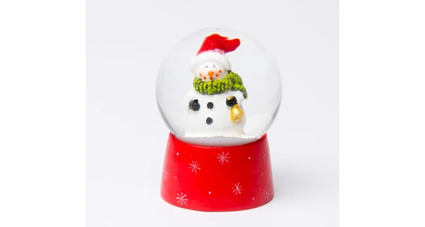 Sněžítko s červeným podstavcem a sněhulákem uvnitř koule.
