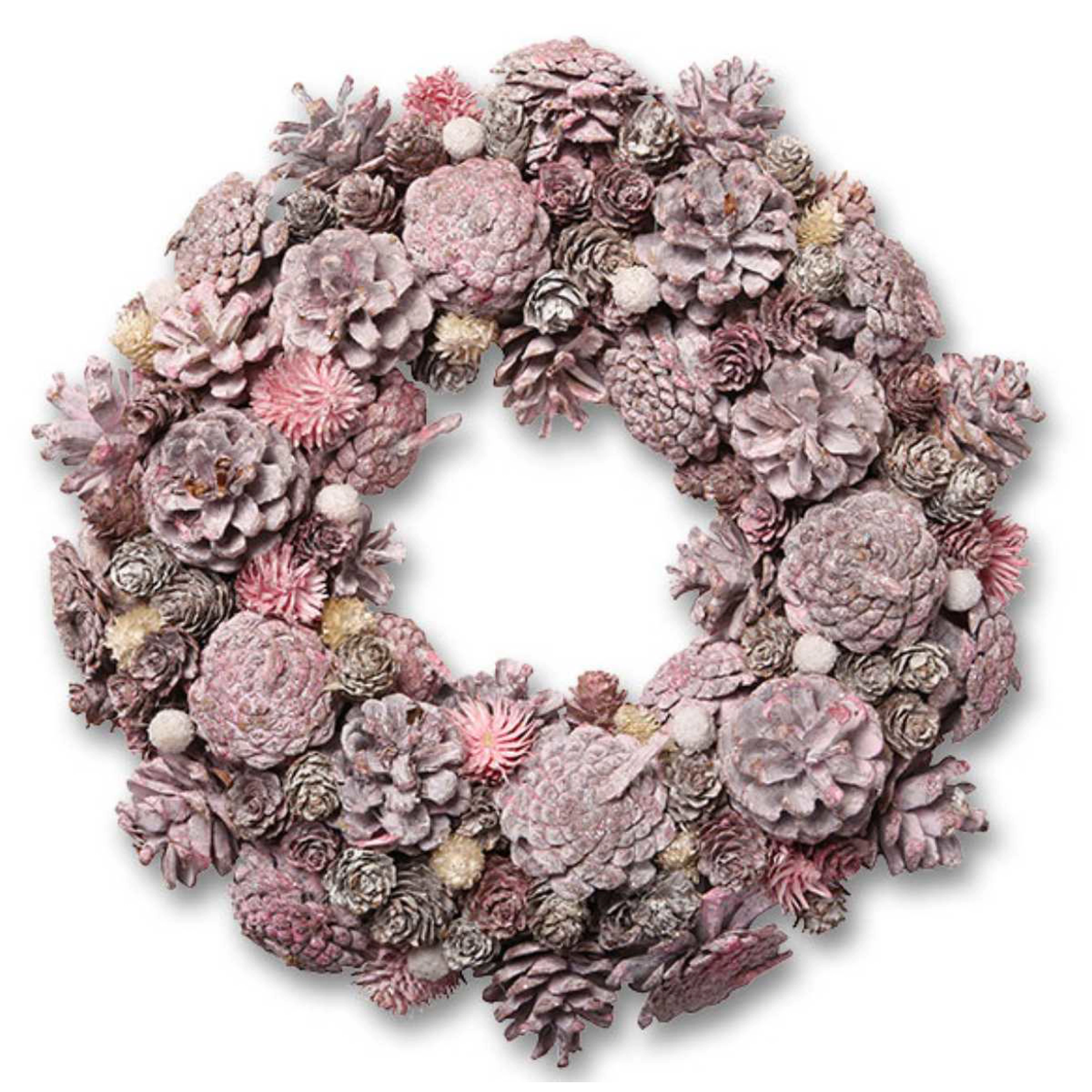 Adventní věnec zdobený barevnými šiškami a drobnými ozdobami v odstínech růžové a stříbrné.