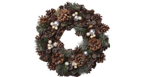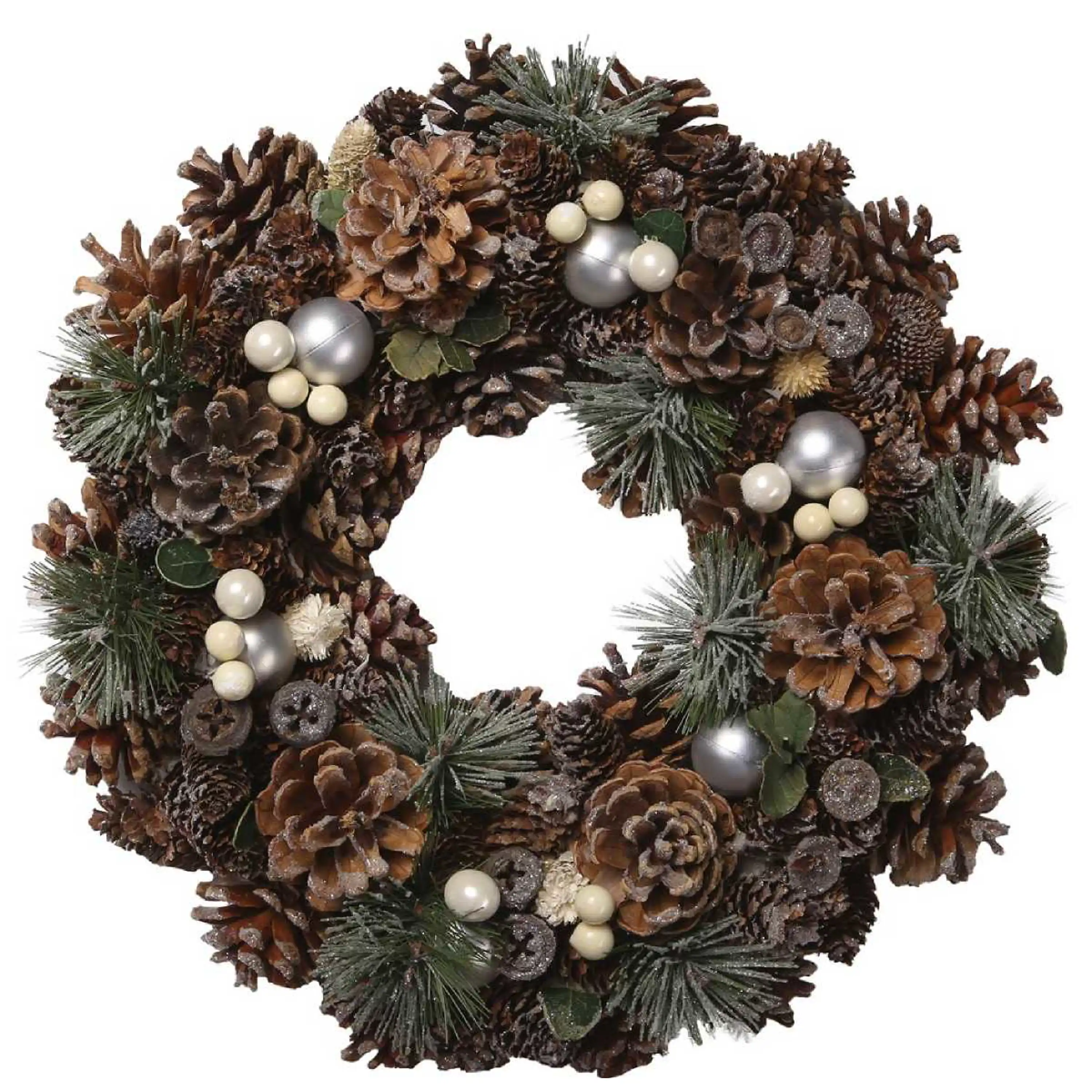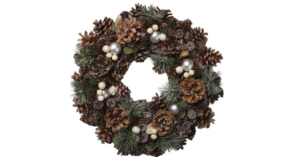 Adventní věnec zdobený šiškami a drobnými ozdobami v přírodních barvách.