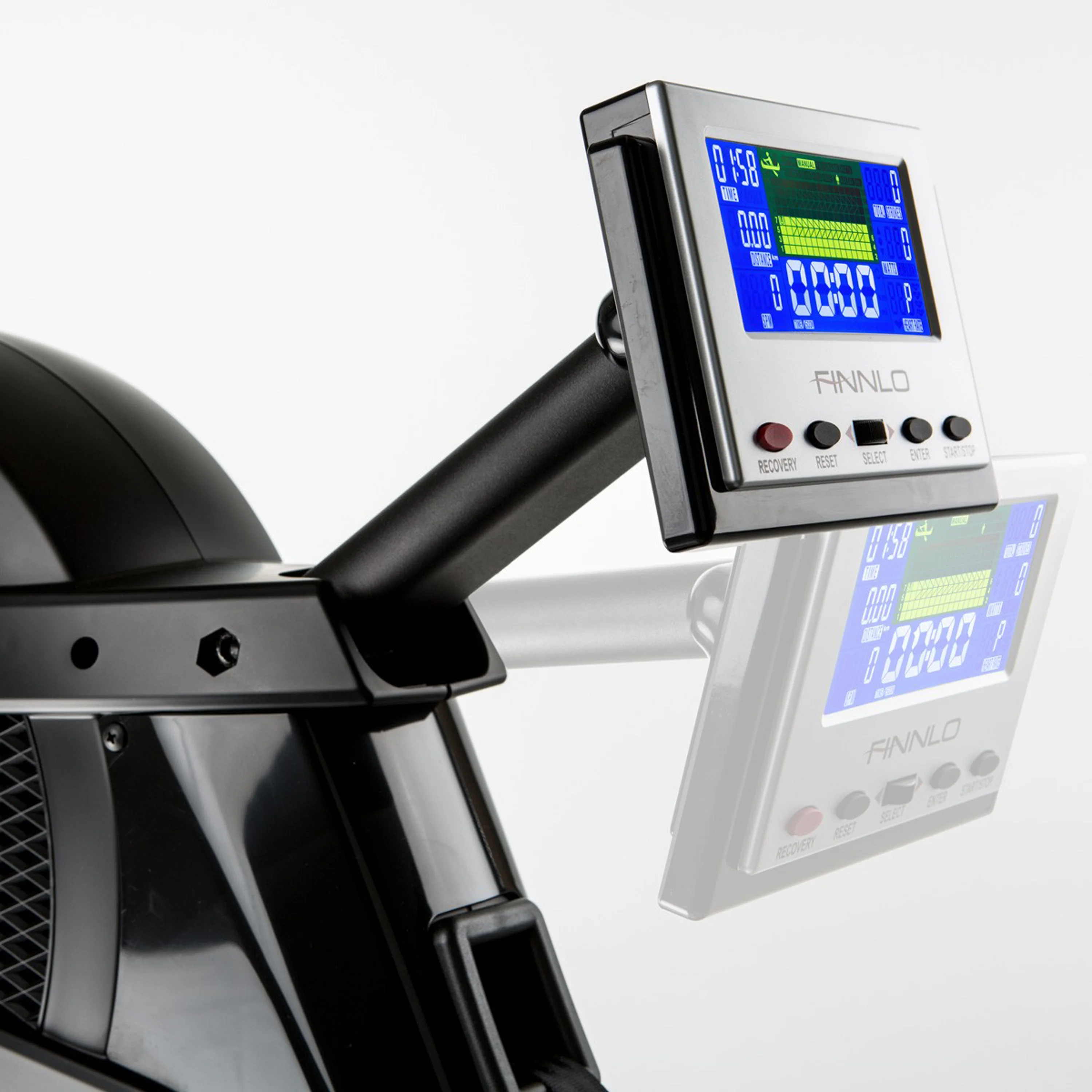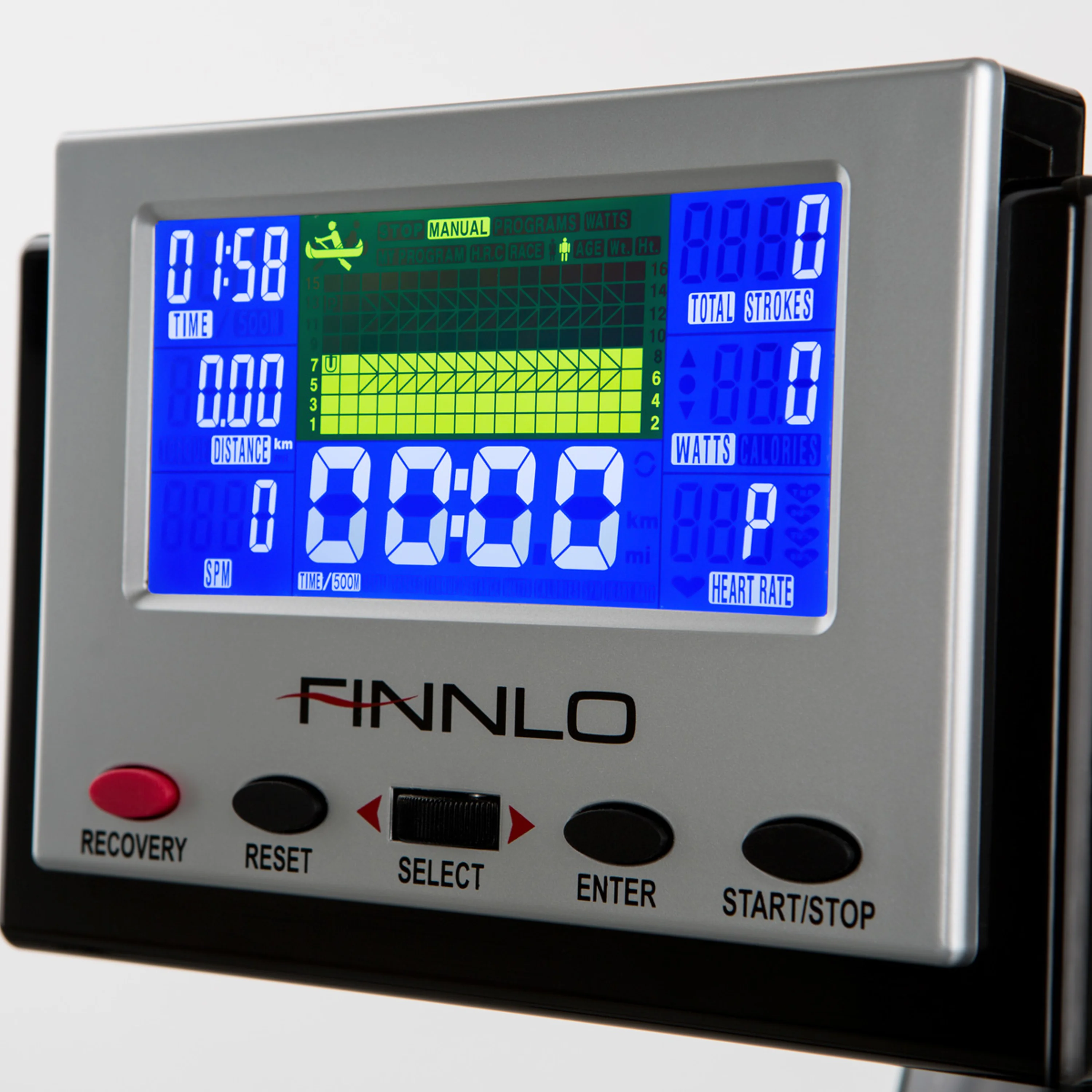 FINNLO Aquon Evolution má přehledný LCD displej s modrým podsvícením, který lze dle potřeb naklánět. Tréninkový počítač nabízí 8 trvale zobrazených hodnot. Měřené údaje jsou: čas, kalorická spotřeba, tepová frekvence, vzdálenost, počet záběrů, záběry/min., čas na ujetí 500 m, watty, nastavení horní hranice tepové frekvence. Ta se měří prostřednictvím hrudního pásu s přesností EKG. Hrudní pás není součástí dodávky, ale je možné jej u nás dokoupit.