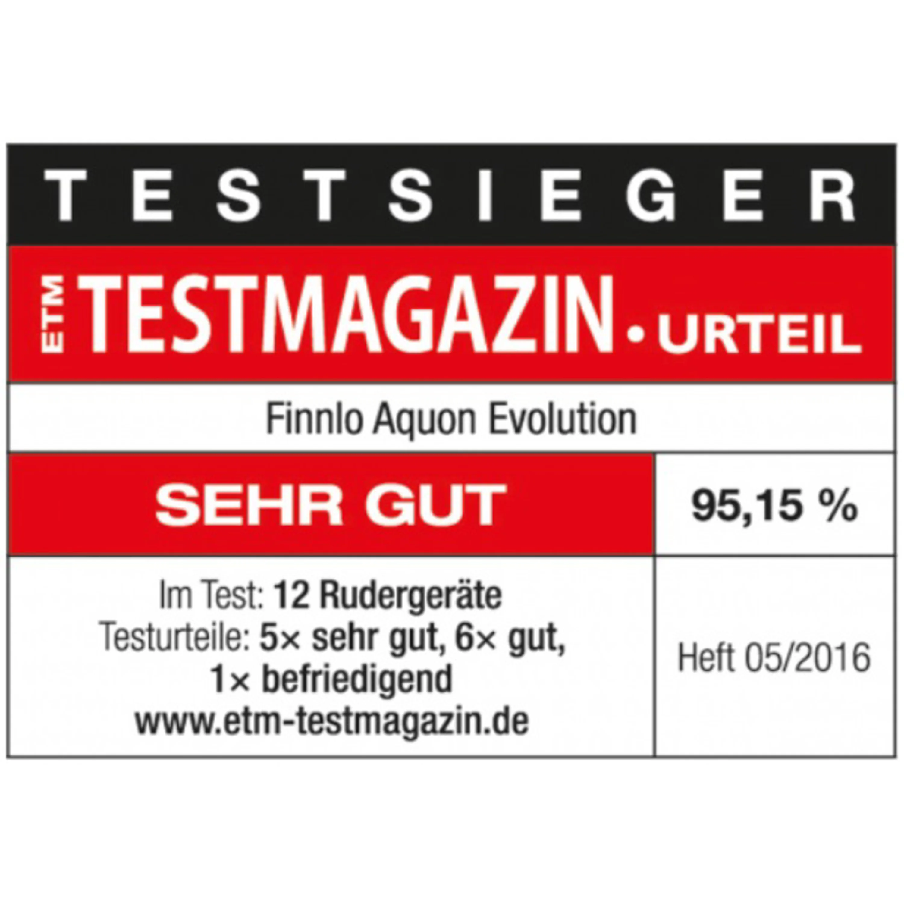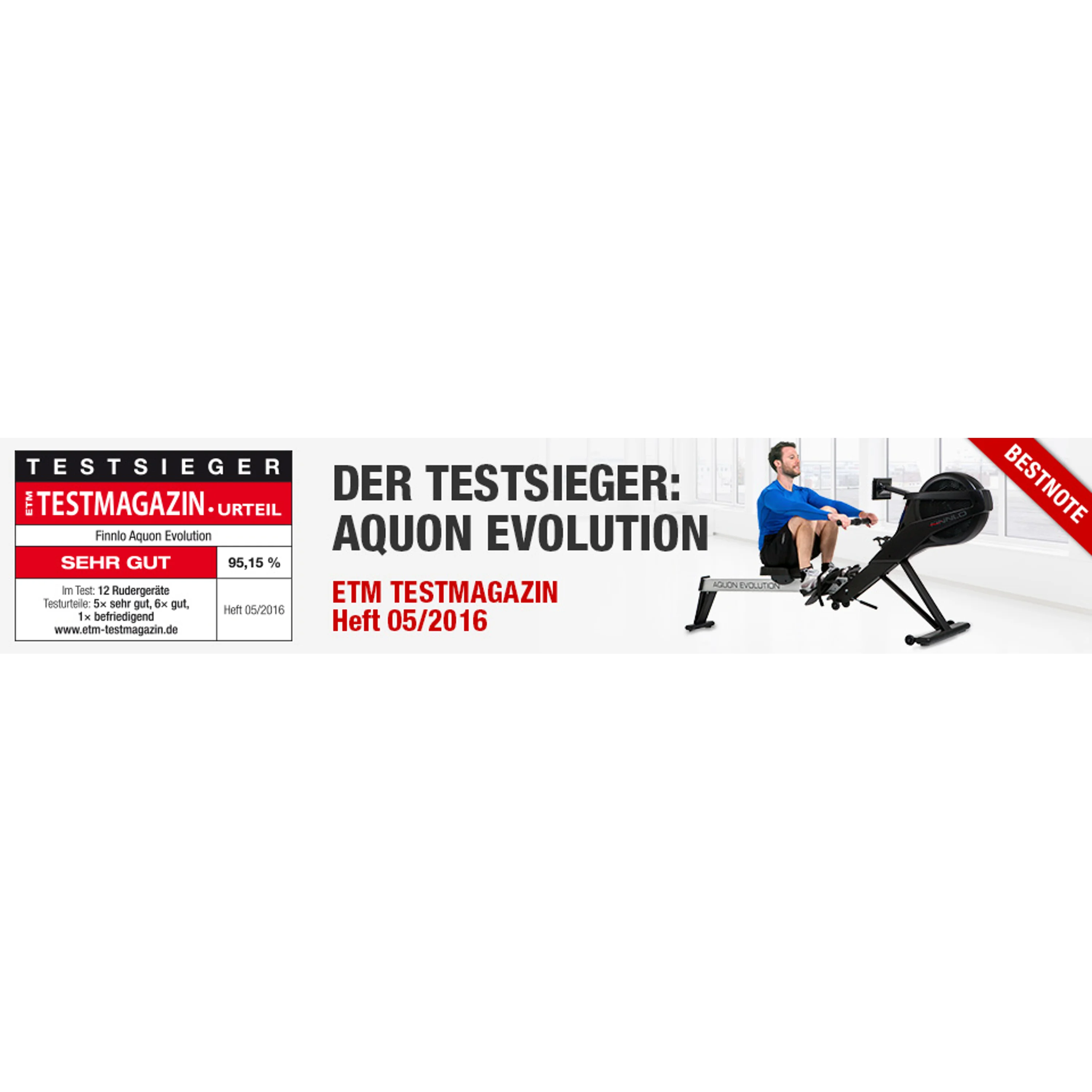 Veslovací trenažér FINNLO Aquon Evolution získal hodnocení "VELMI DOBRÝ" (95,1 %) v testu veslovacích trenažérů německým časopisem Testmagazin.