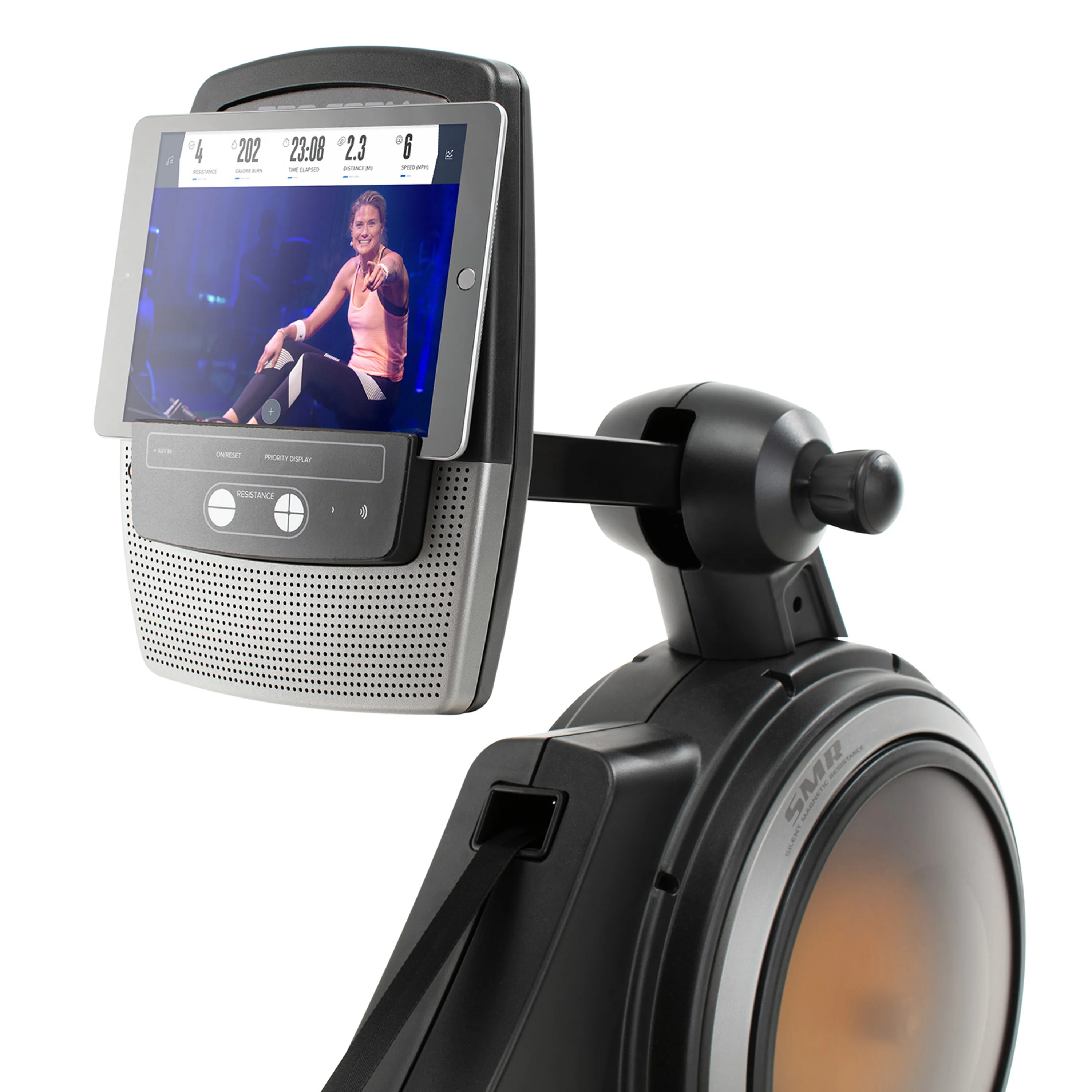Počítač má podsvícený LCD displej, která se snadno ovládá a zobrazuje všechny běžné hodnoty. Vyobrazené parametry na displeji jsou čas, vzdálenost, odpor, rychlost veslování, spálené kalorie apod. Konzole nabízí širokou programovou nabídku, a to 24 přednastavených programů zaměřených na spalování kalorií nebo budování tělesné kondice. Držák tabletu je součástí.