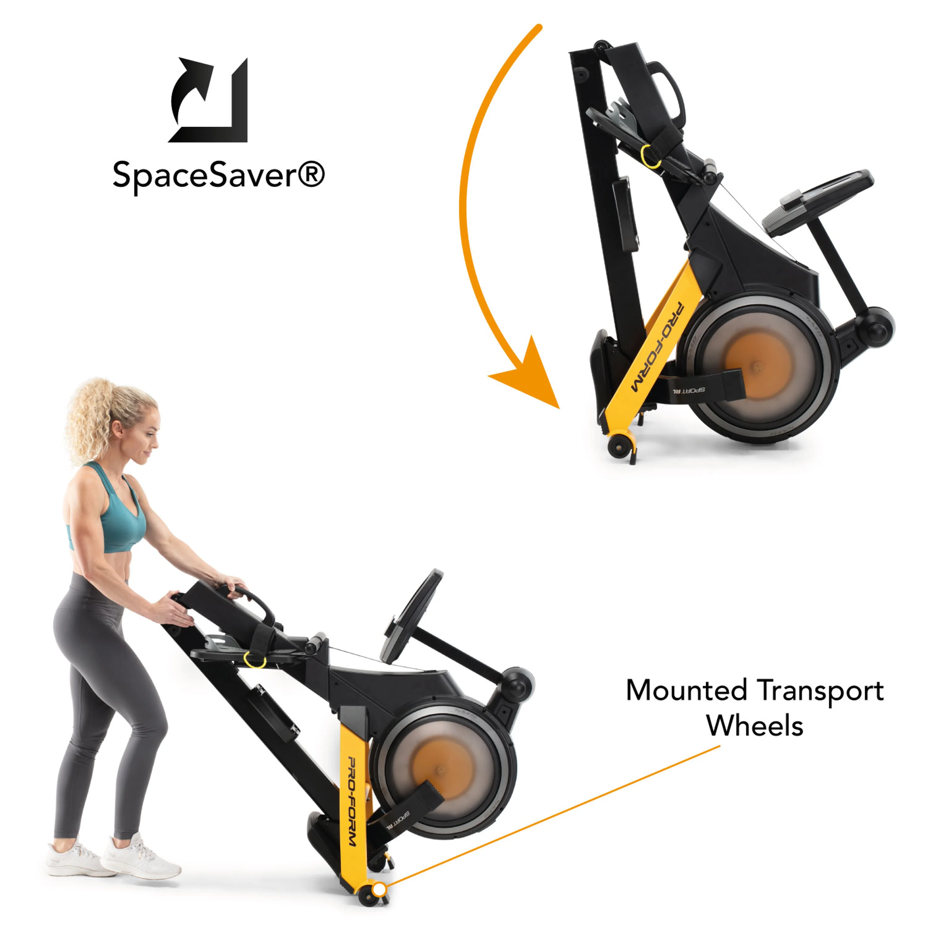 Inovativní skládací systém "SpaceSaver" s transportními kolečky na přední straně uvítáte v domácnosti, kde není místa nazbyt. Stroj snadno složíte a uklidíte ve chvíli, kdy zrovna necvičíte.