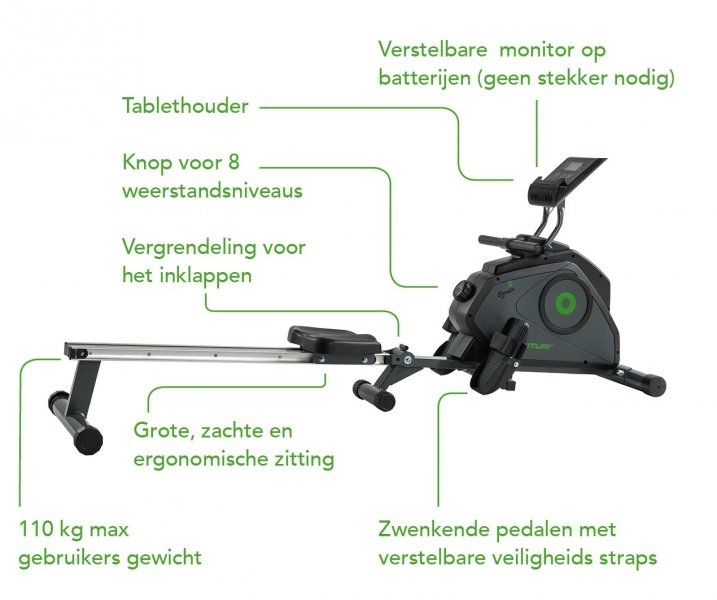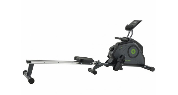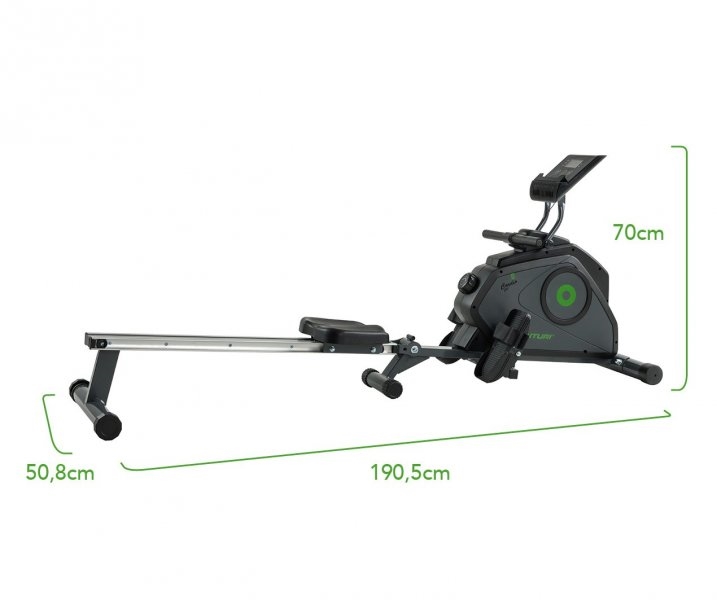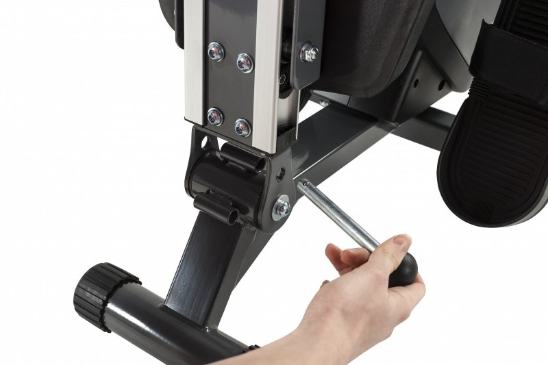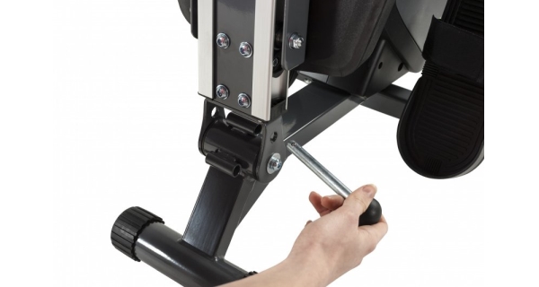 Kompaktní trenažér pro domácí použití. Skládací kolejnice vyrobené z hliníku pro pohodlné skladování. Držák tabletu. Komfortní ergonomické sedlo pro ideální pozici při veslování.