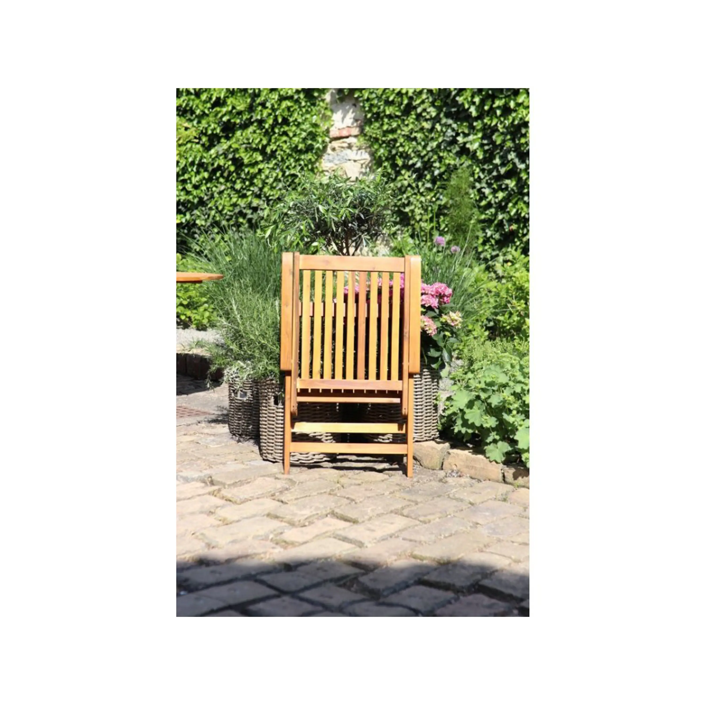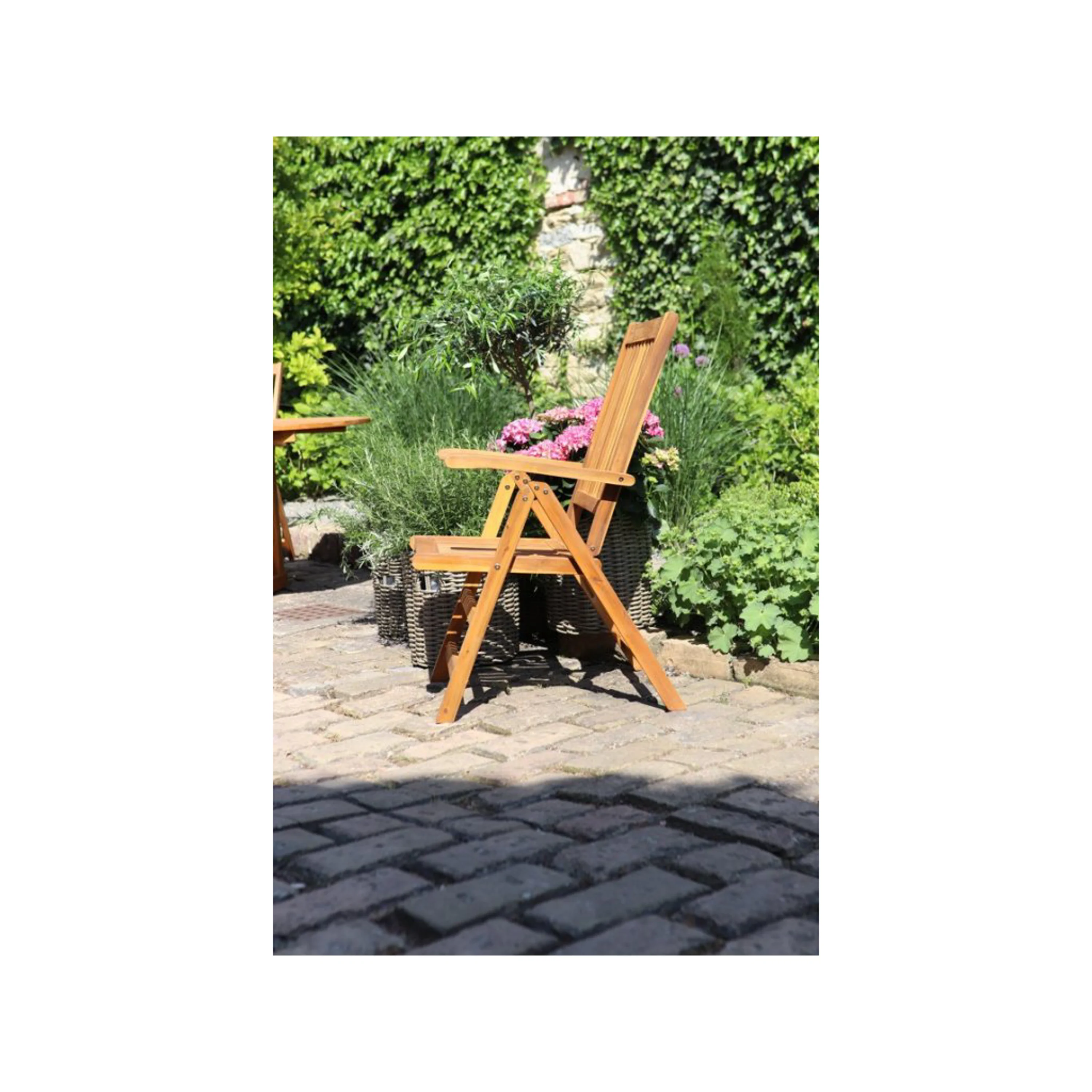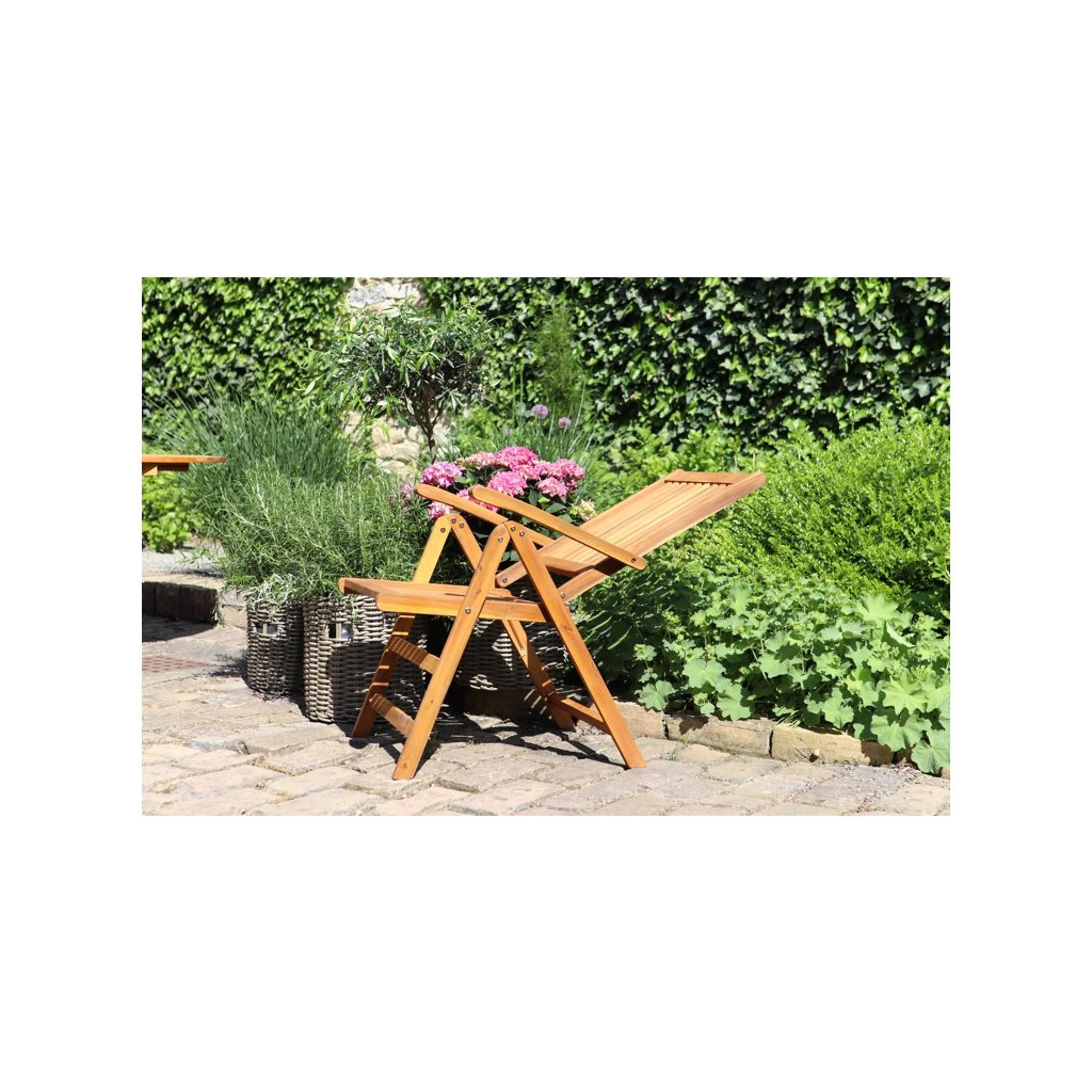 Viet akáciová polohovací a skládací židle s područkou. Vhodná do interiéru i exteriéru. Nenáročná na údržbu. Doporučujeme natírat pravidelně ochranným olejem.