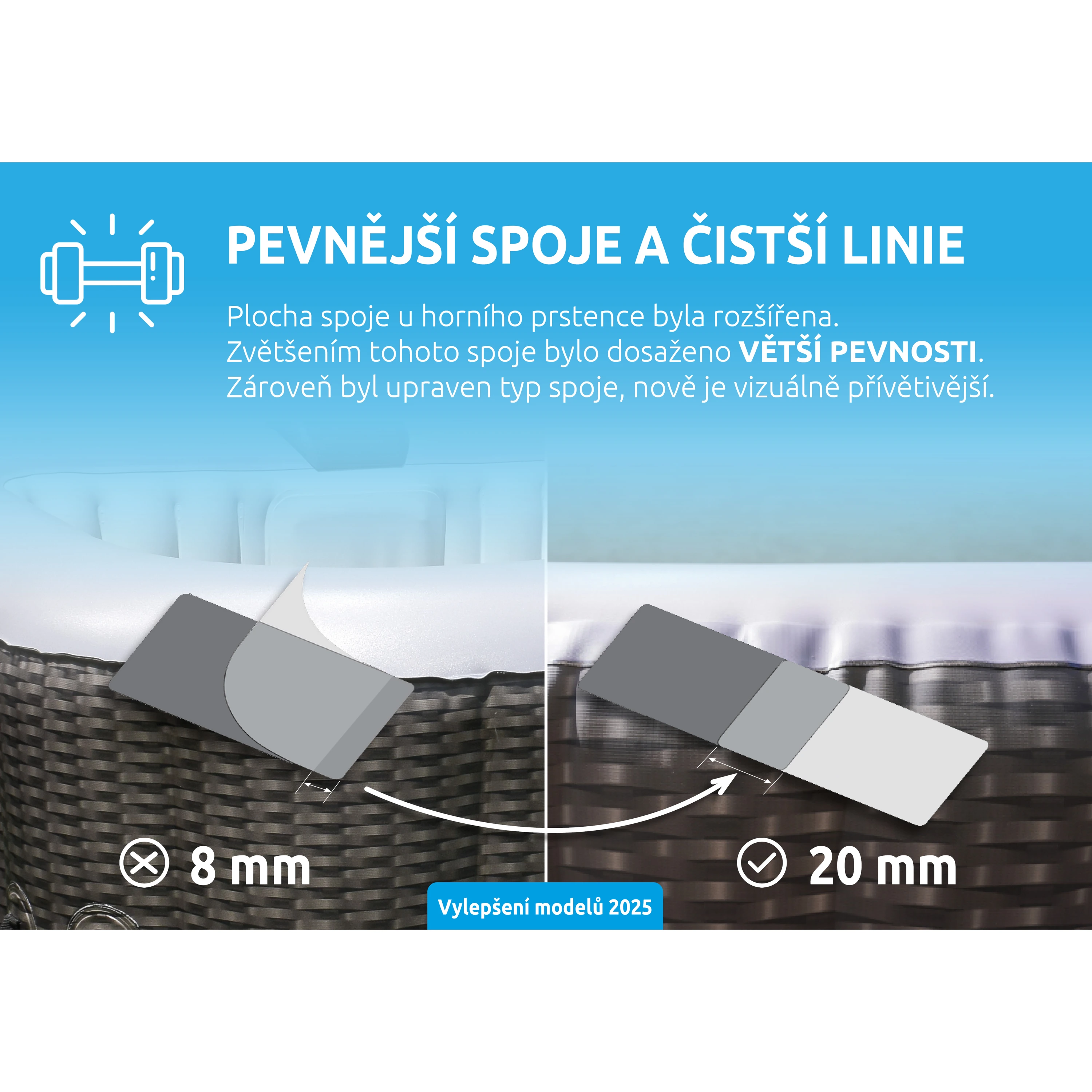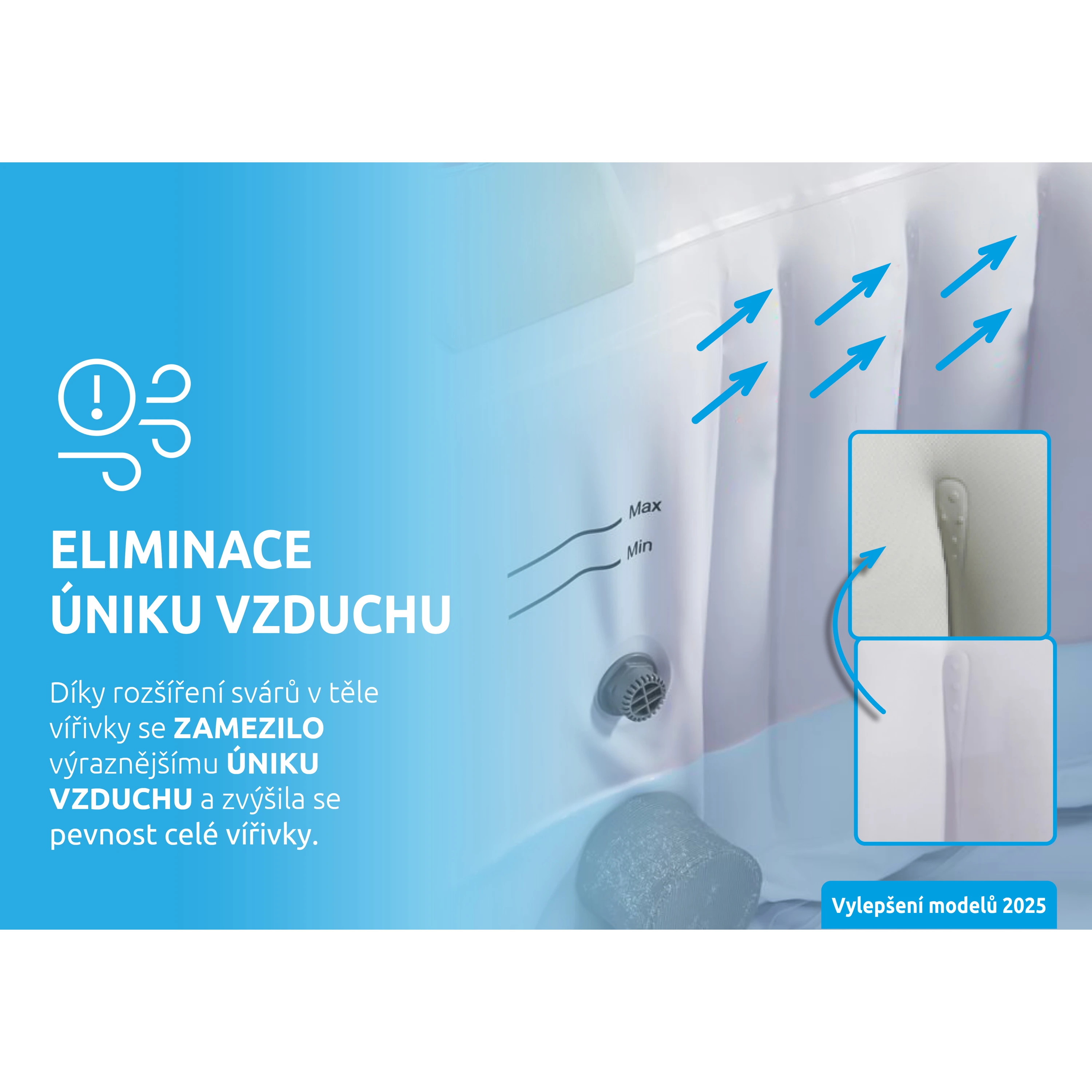 Eliminace úniku vzduchu - Díky rozšíření svárů v těle vířivky se zamezilo výraznějšímu úniku vzduchu a zvýšila se pevnost celé vířivky.