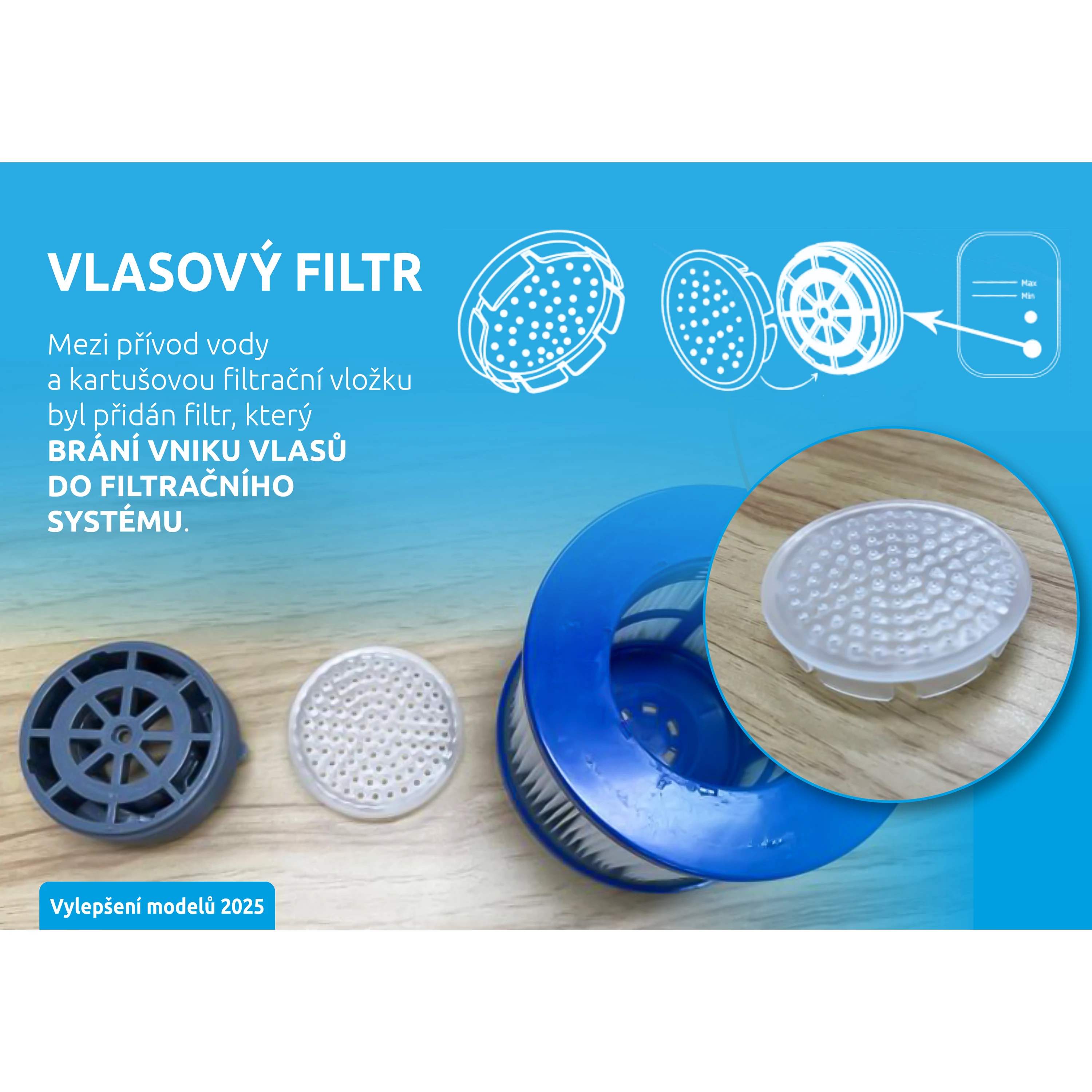 Vlasový filtr - Mezi přívod vody a kartušovou filtrační vložku byl přidán filtr, který brání vniku vlasů do filtračního systému.