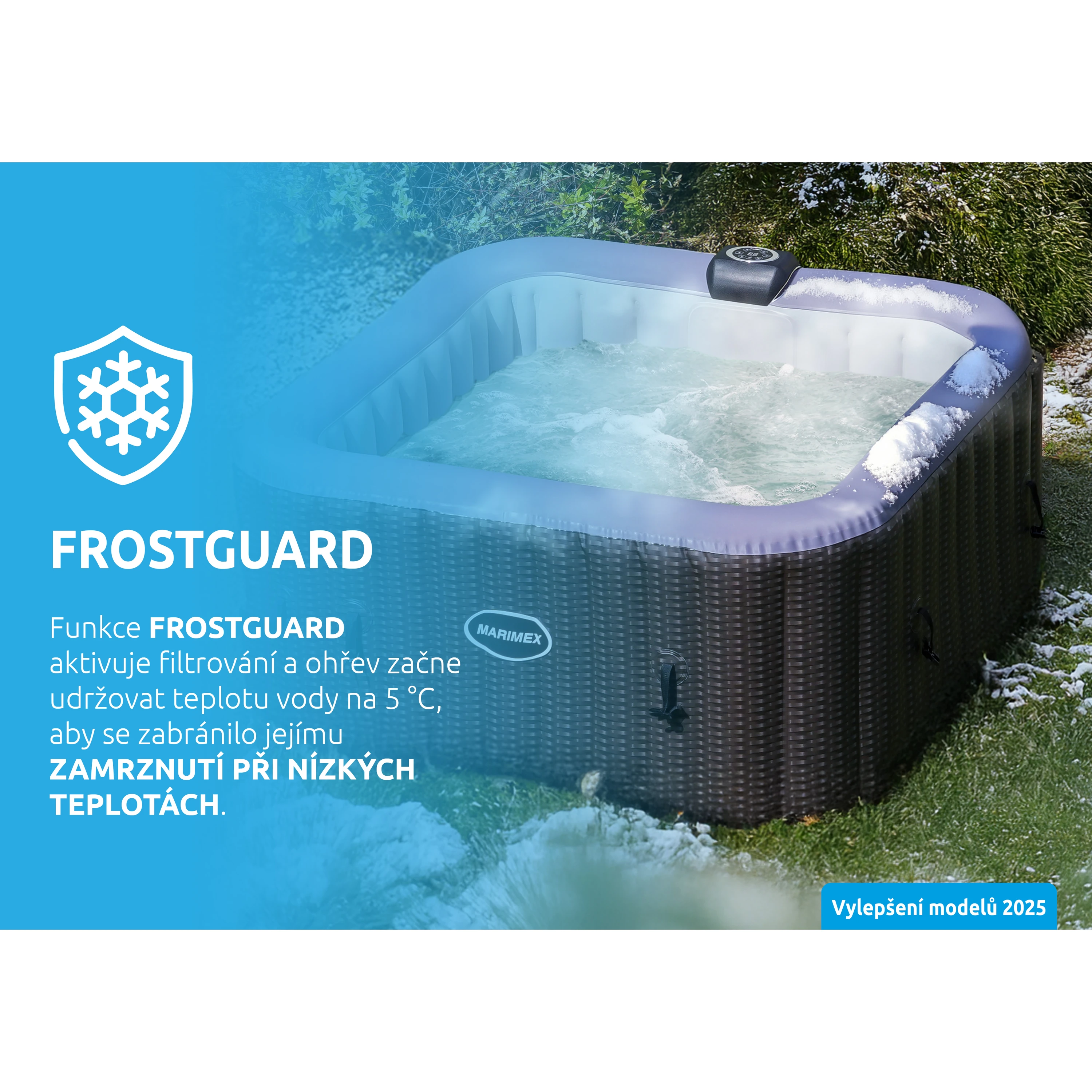 Díky funkci Frostguard je možné vířivku bezpečně provozovat i během zimních měsíců, a to až do teploty -5 °C. Tento systém automaticky udržuje teplotu vody okolo 5 °C, čímž zabraňuje jejímu zamrznutí a chrání vnitřní technologie. Aby byla vířivka v zimě plně chráněná, je nutné mít funkci Frostguard nepřetržitě zapnutou. S neaktivovanou funkcí Frostguard hrozí zamrznutí vody uvnitř zařízení a následné nenávratné poškození komponentů. Pokud vířivku zrovna nevyužíváte, doporučujeme ji zakrýt vhodným krytem, který pomáhá snižovat tepelné ztráty. Při poklesu venkovní teploty pod 4 °C je před nafouknutím potřeba nechat plášť vířivky aklimatizovat ve vyhřáté místnosti po dobu 24 hodin. Ve velkém mrazu nedoporučujeme vířivku dlouhodobě používat ve venkovních podmínkách.