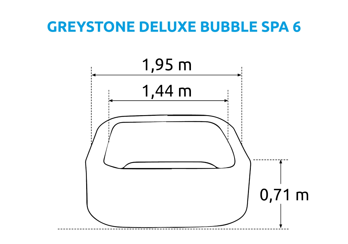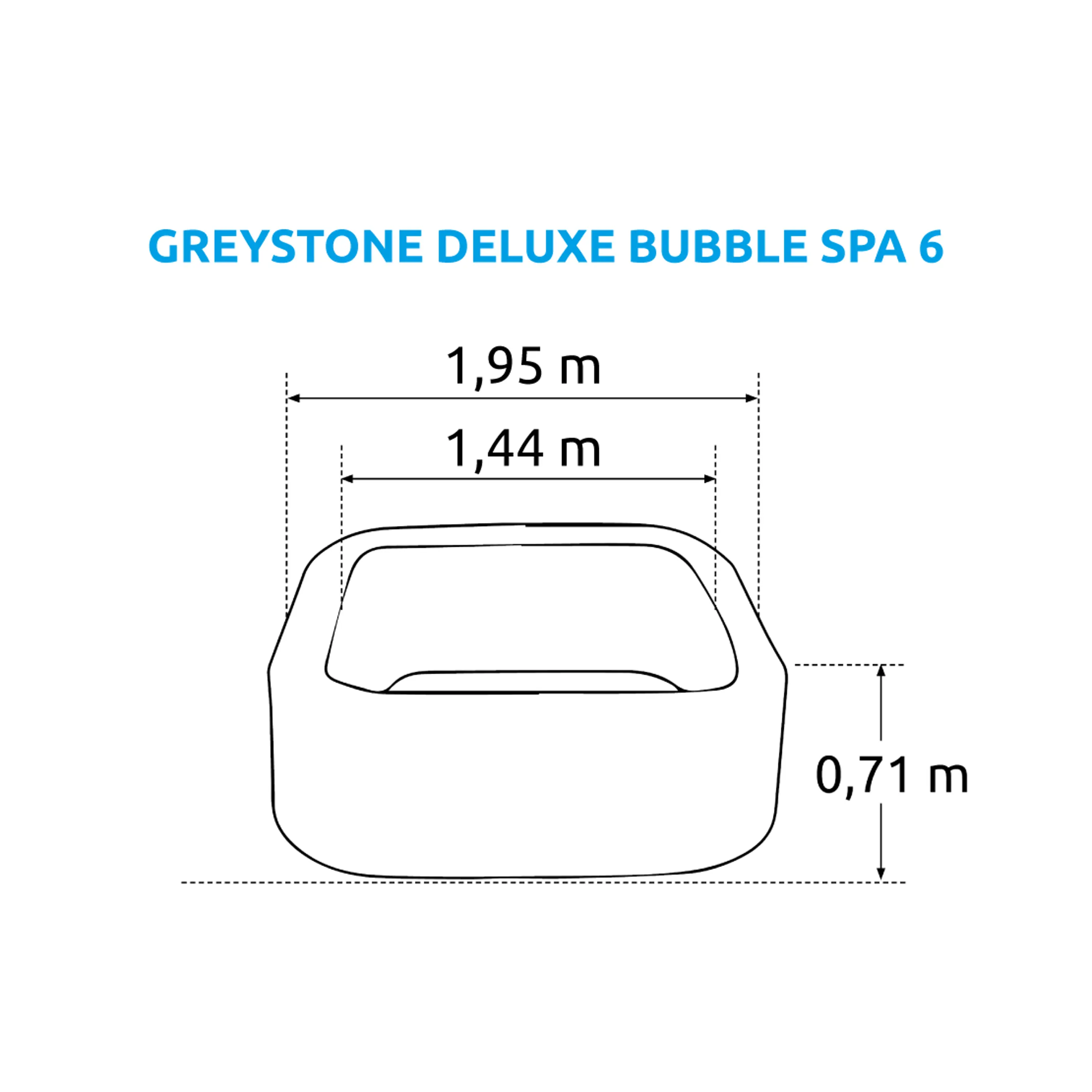 Vířivý bazén Greystone Deluxe Bubble Spa 6 disponuje novou funkcí WIFI pro spárování a ovládání vířivky pomocí mobilního telefonu. Dalším benefitem je systémem HWT na změkčování vody. Díky jejím rozměrům je vhodná až pro šest osob. Vířivka má 170 vysoce výkonných bublinkových trysek, které masáží povzbudí každý sval. Vana je vyrobena z vysoce kvalitního 3 vrstvého PVC. Disponuje konstrukcí 55 FIBER-TECH BEAMS (silná polyesterová vlákna).