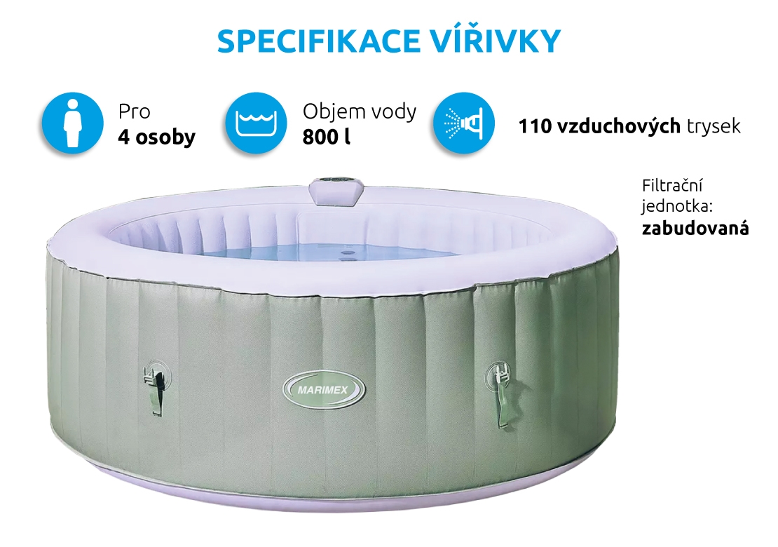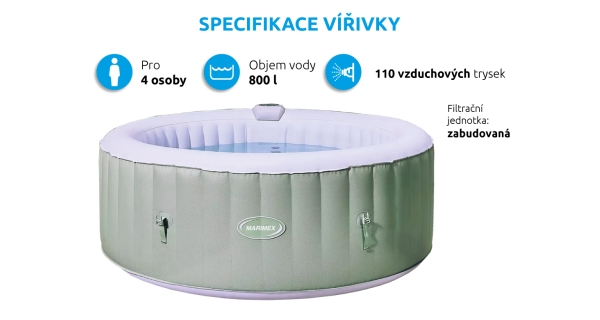 Vířivý bazén Aquamar 4881 o objemu 800 l je vhodný až pro 4 dospělé osoby. Ve výbavě má 110 vzduchových trysek. Laminovaná tkanina s termoizolační a UV ochrannou vrstvou zaručuje vynikající výkon vířivky. Je to dokonalá kombinace kvality, pevnosti a stability. Kartušový filtr pomáhá odstranit nečistoty, prach a další špínu. Balení obsahuje snímatelný potah, který zachycuje vlasy a drobná smítka.