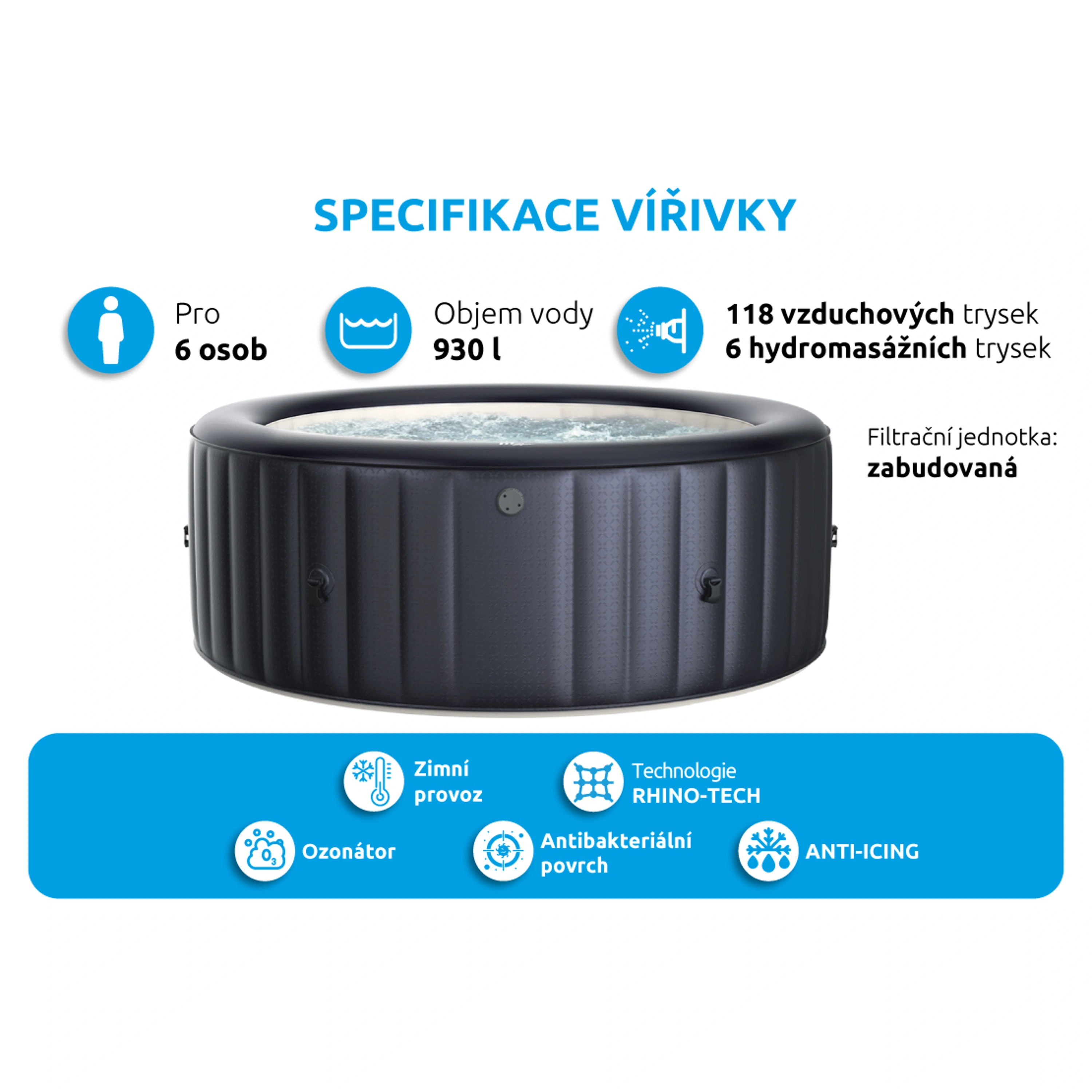 - Trysky: 118 vzduchových trysek + 6 Hydro-jets trysek