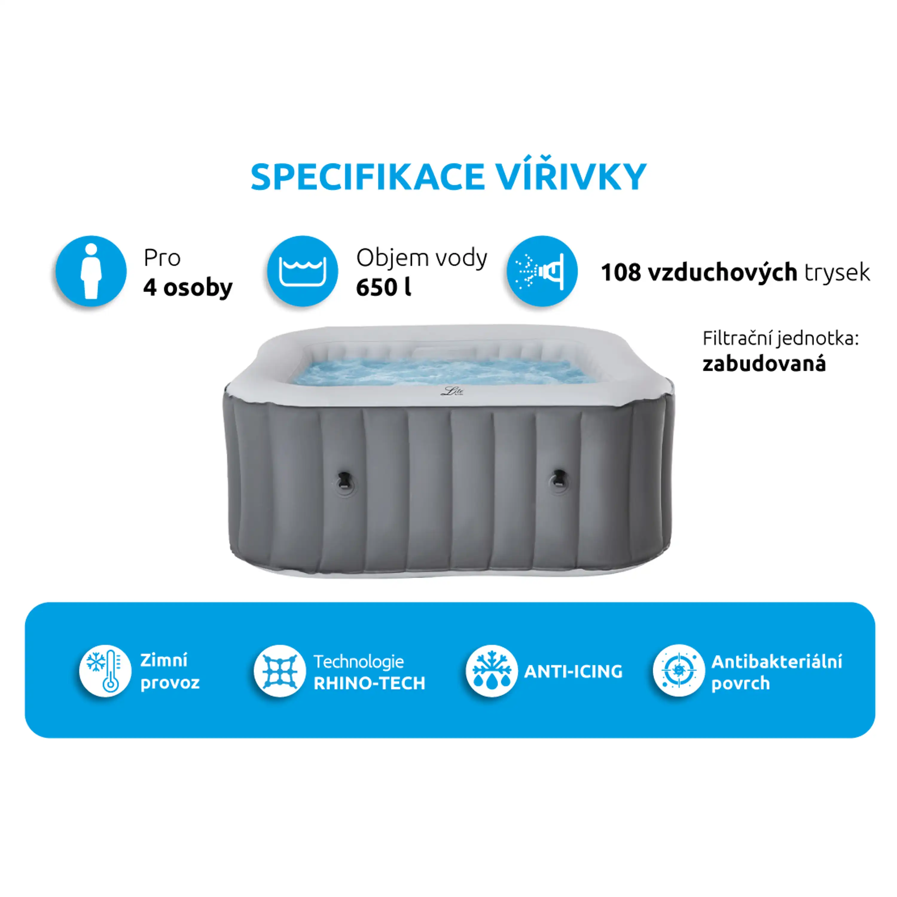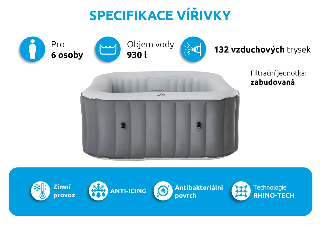 Úplně nový systém ANTI-ICING bude neustále dohlížet na vaši vířivou vanu a hlídat bezpečnou úroveň teploty. Pokud teplota vody poklesne pod 1°C, ohřev se automaticky spustí, dokud teplota vody nestoupne na 3°C. Toto zabrání vodě v zamrznutí a ochrání tak cirkulační systém, čerpadlo a trubky před poškozením. Při poklesu teploty venku pod 4°C je nutné před nafouknutím nechat plášť vířivky aklimatizovat v teplé místnosti po dobu 24 hod. Po nafouknutí je nutné ji ihned napustit vodou a zapnout ohřev.