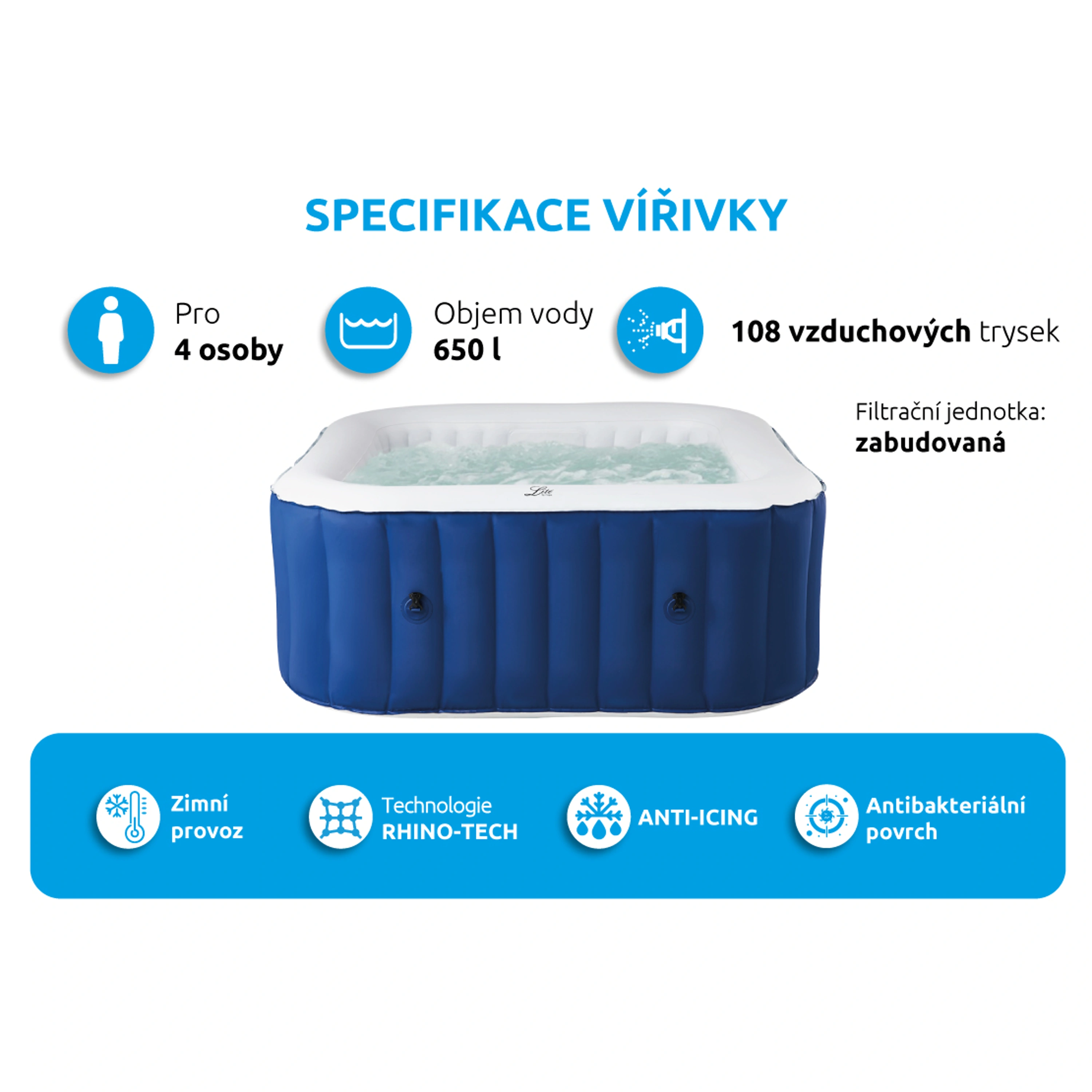 Vířivka je vybavena 108 vzduchovými tryskami a samozřejmě i účinným ohřevem vody.