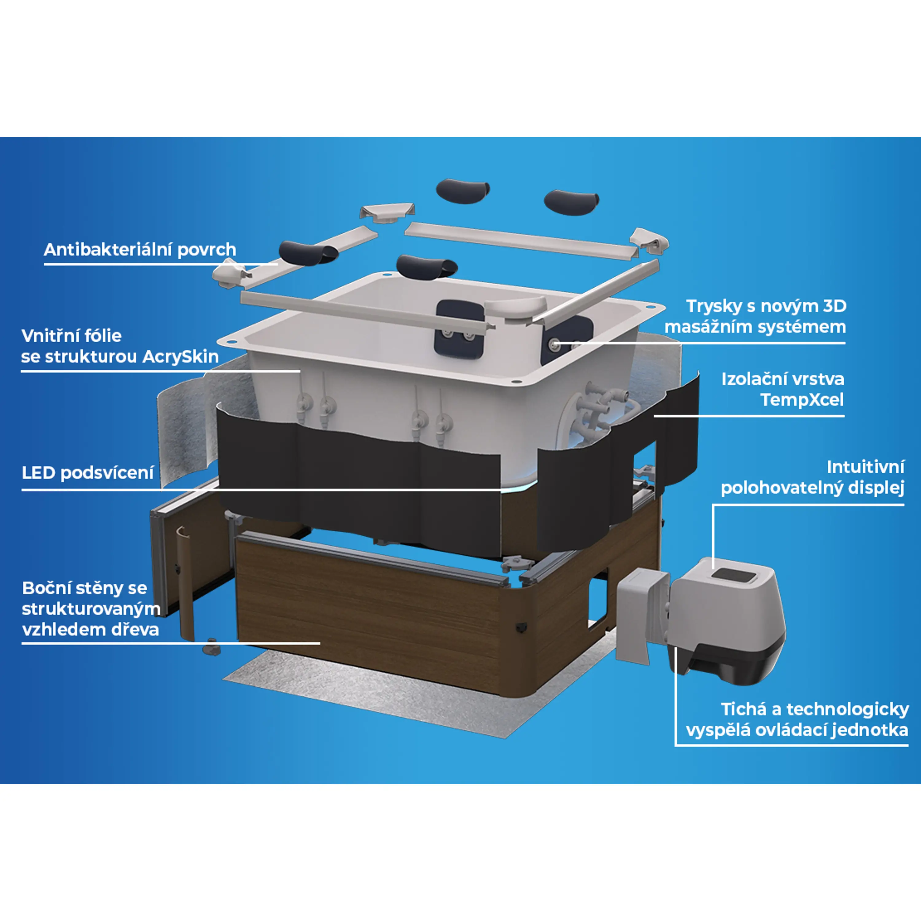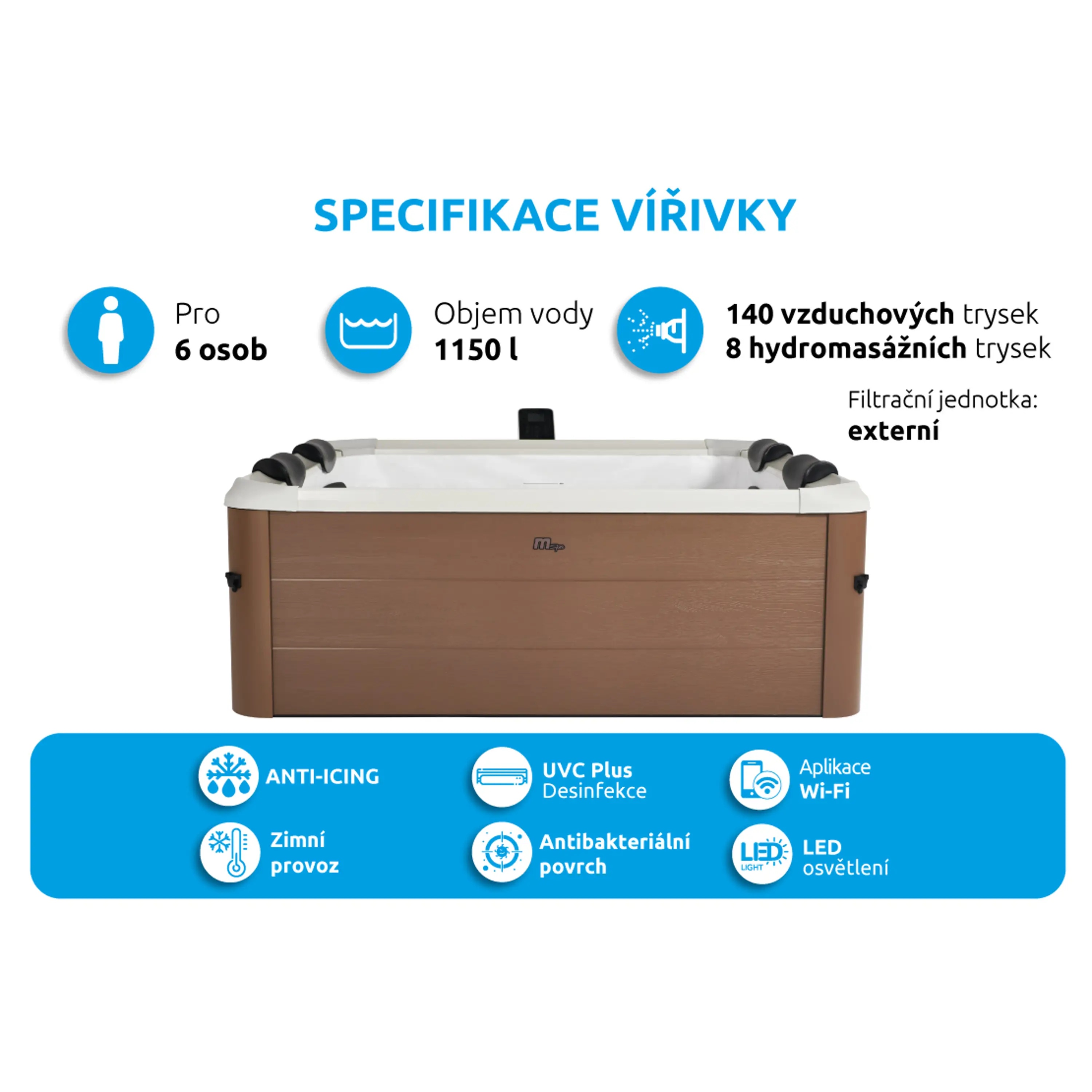 - Trysky: 140 vzduchových + 8 nastavitelných hydromasážních trysek
