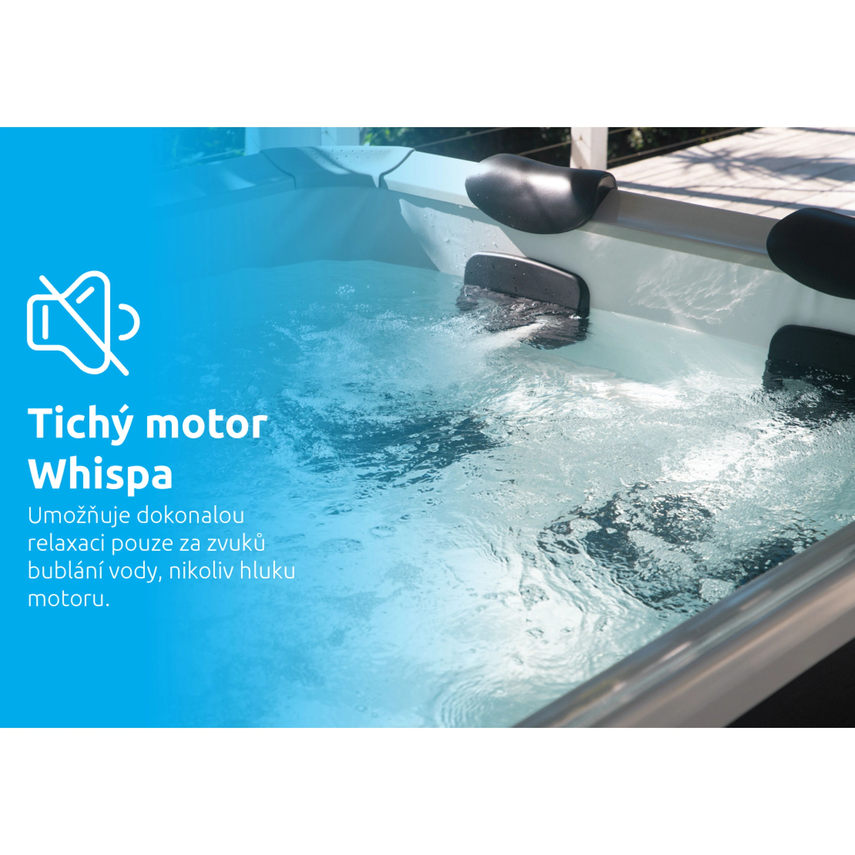 Tichý motor Whispa umožňuje dokonalou relaxaci pouze za zvuků bublání vody, nikoliv hluku motoru.