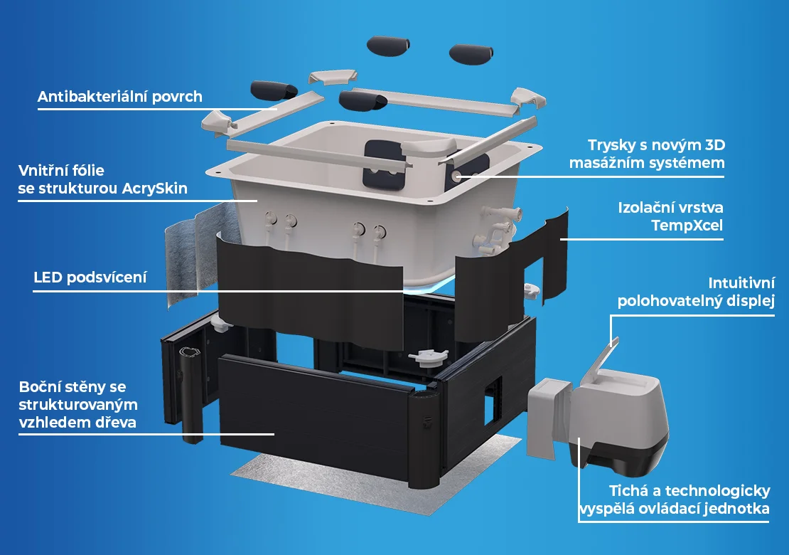 - Trysky: 120 vzduchových + 8 nastavitelných hydromasážních trysek
