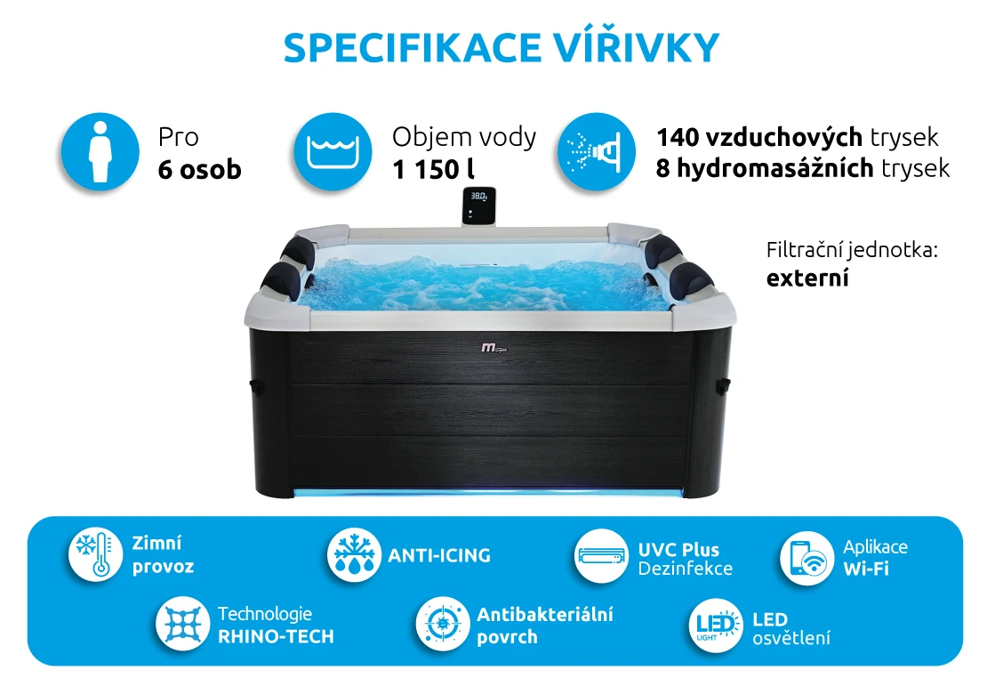 - Trysky: 140 vzduchových + 8 nastavitelných hydromasážních trysek